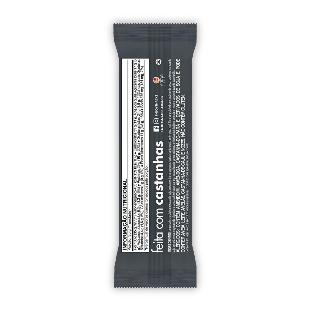 A Barra de Nuts Enjoy com Proteína Banana + Canela traz a opção tradicional dos sabores da banana e das castanhas, com um delicioso toque de canela. A sua opção mais gostosa para o pré ou pós treino. A Barra de Nuts Enjoy com Proteína é a ÚNICA barra proteica a base de castanhas do Brasil. Com 3 sabores disponíveis, ela é feita com proteína 100% vegetal de soja não transgênica, adoçada com açúcar de coco e mel. Ela oferece 10g de proteínas e em média 4 de fibras, a opção perfeita para proporcionar mais saciedade e disposição para o seu corpo. – 35g por porção – Do tamanho perfeito para matar a sua fome. – 3 sabores disponíveis. – Adoçada com açúcar de coco e mel. – Feita com proteína 100% vegetal de soja não transgênica. – ÚNICA barra proteica feita a base de Nuts do Brasil. – Feita com castanhas, frutas e sementes selecionadas. – Rica em proteínas, fibras e gorduras boas. – Saciedade por MAIS tempo. – Forma prática e saudável de consumir castanhas e frutas. Dica de consumo: Pré ou pós treino, lanches intermediários, para acompanhar uma fruta ou iogurte