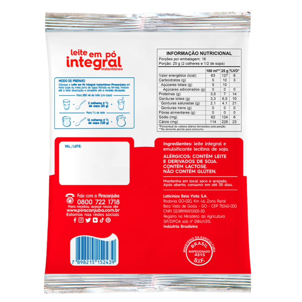 | Pack 3 unidades Leite em Pó Integral Instantâneo Piracanjuba 400g -... este produto | R$ 64,47 | — | 4.9/5 | 7 |