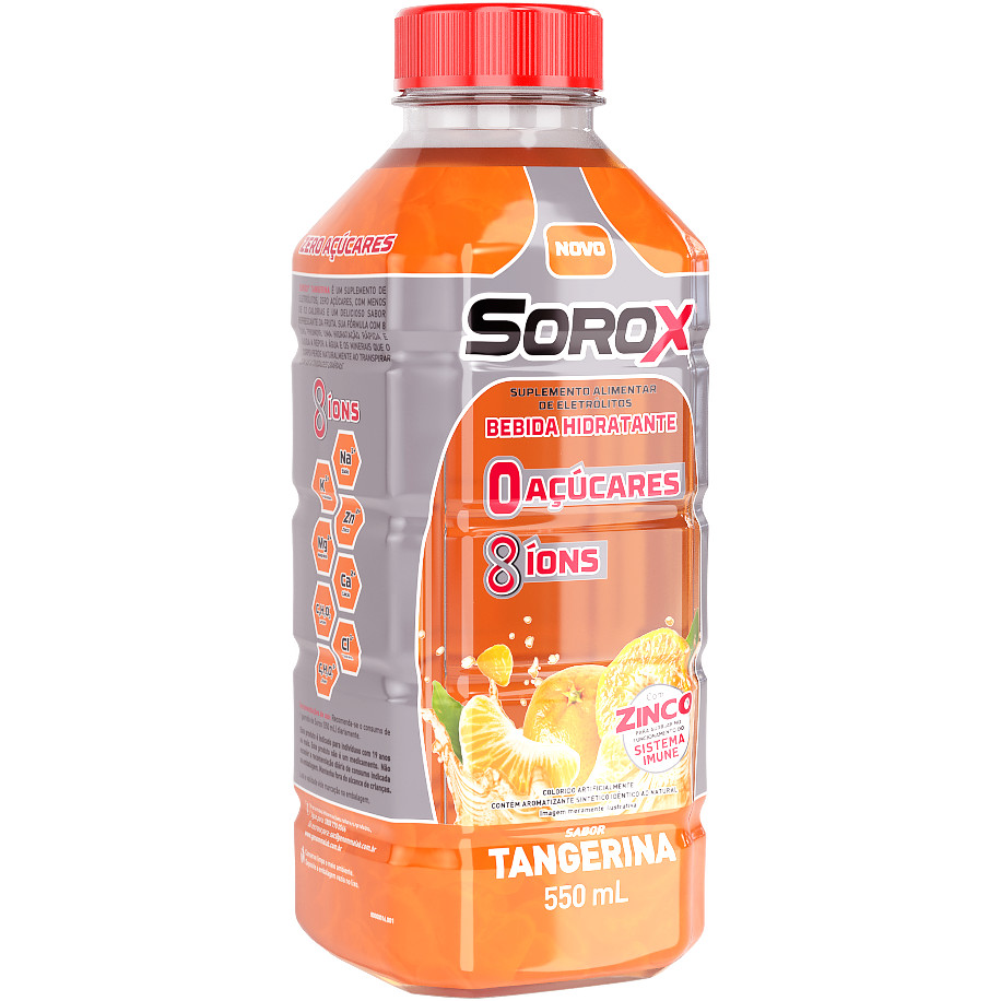 O peso líquido do conteúdo é de 550ml. O Hidrotônico Sorox sabor Tangerina é a bebida perfeita para manter o seu corpo hidratado após atividades físicas e exposição ao calor. Sorox possui os sais e minerais que o seu corpo necessita. Sorox contém 8 íons que ajudam a recuperar os minerais perdidos, seja por estar exposto a altas temperaturas ou por atividades físicas. [Sódio, Potássio, Cálcio, Citrato, Zinco, Cloreto, Lactato e Magnésio] Uma Super combinação do que o seu corpo precisa. Sorox é uma forma excepcional de recuperar liquidos e eletrólitos. Sorox proporciona uma hidratação sem açucar e deixa uma sensação fantástica em seu paladar, com diferentes sabores, revigora o corpo após uma atividade física, pois contém alto valor nutricional. Modo de Uso: Recomenda-se o consumo de 1 garrafa de Sorox (550 mL) diariamente.