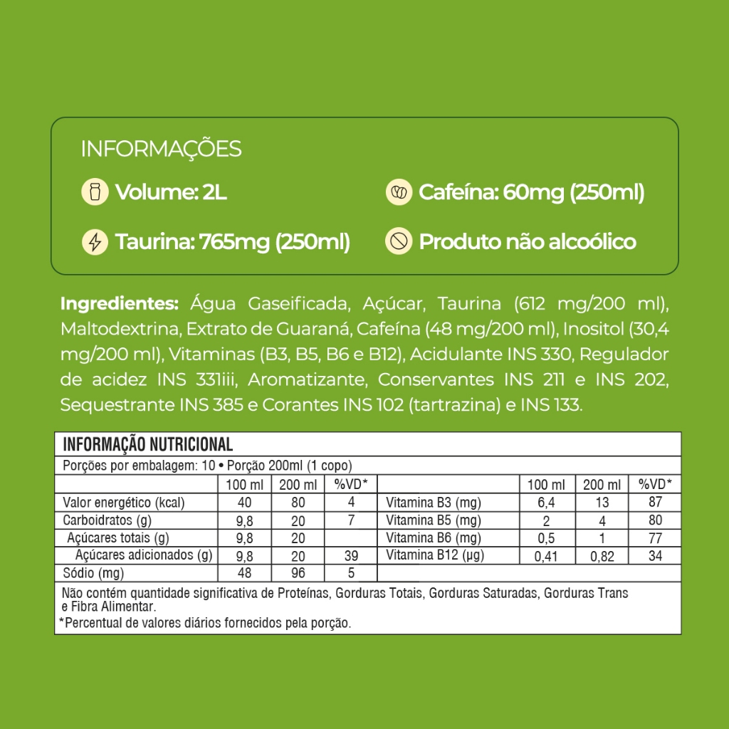 A Baly é a maior marca brasileira de energéticos, pioneira e líder no Brasil em embalagens 2L, e o Maçã Verde 2L é leve, autêntico e cheio de frescor, perfeito para quem busca equilíbrio e energia. Com o sabor leve e refrescante da maçã verde, cada porção traz intensidade com Taurina, Cafeína e Vitaminas do Complexo B. Seja na resenha com os amigos, pegando aquele solzão na praia, virando a noite no game ou encarando a semana de provas, Baly tá sempre com você! Perfeito para compartilhar com a galera ou celebrar em família, o Baly Energy Drink Maçã Verde na litragem 2L oferece mais quantidade e energia, mantendo o sabor e a brasilidade que só a Baly entrega. Nascemos no Carnaval, da mistura que só o Brasil tem, e cada lata carrega essa energia única e vibrante. Também disponível na versão Zero Açúcar Produto não alcoólico