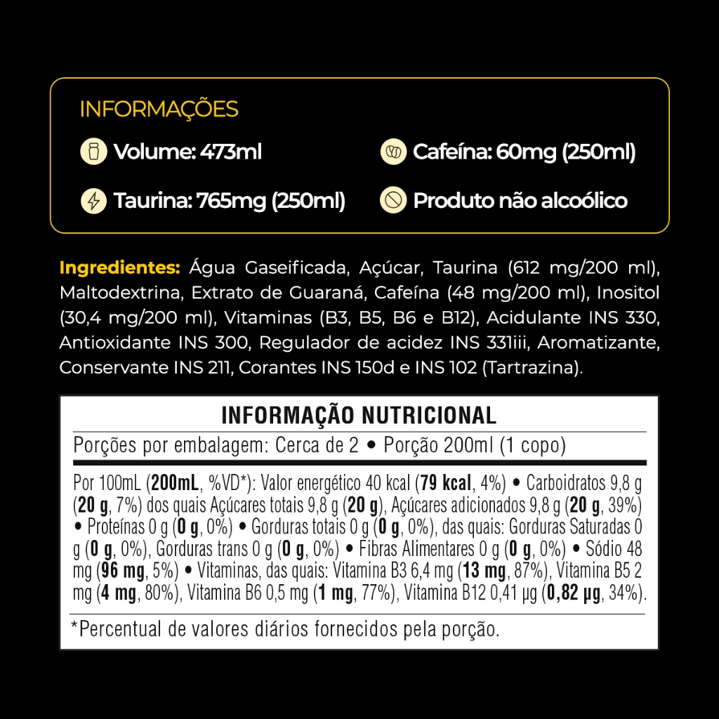 A Baly é a maior marca brasileira de energéticos, e o Tradicional 473ml é o clássico que conquistou o país inteiro. Com o sabor tradicional que é a cara do Brasil, cada gole traz refrescância e intensidade, com uma combinação de Taurina, Cafeína e Vitaminas do Complexo B. Seja na resenha com os amigos, pegando aquele solzão na praia, virando a noite no game ou encarando a semana de provas, Baly tá sempre com você! Baly Energy Drink Tradicional na litragem 473ml é a escolha perfeita pra compartilhar e dividir a energia com a galera. Inspirado nos ingredientes e gostos que fazem parte da nossa cultura, o Baly Energy Drink traz sabores que são a cara do Brasil. - Também disponível na versão Zero Açúcar - Produto não alcoólico