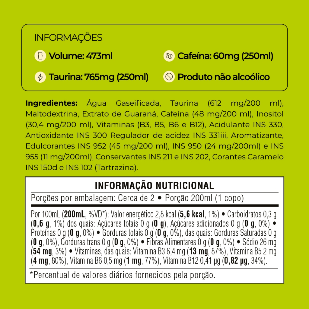 O sabor que conquistou o Brasil também está disponível na versão Sem Açúcar. O Baly Tradicional Sem Açúcar mantém toda a intensidade e refrescância do clássico, mas sem adição de açúcar e sem gosto residual de adoçante. Uma escolha perfeita pra quem busca mais energia com sabor de verdade. Combinando Taurina, Cafeína e Vitaminas do Complexo B, entrega foco, disposição e performance, seja no treino, na corrida ou apenas para quem quer o mesmo sabor e energia Baly, sem adição de açúcares. A lata de 473ml é ideal pra quem não abre mão de custo-benefício, oferecendo mais quantidade e energia em cada unidade, além de ser perfeita pra compartilhar com a galera. - Sem açúcar de verdade - Sem glúten - Produto não alcoólico