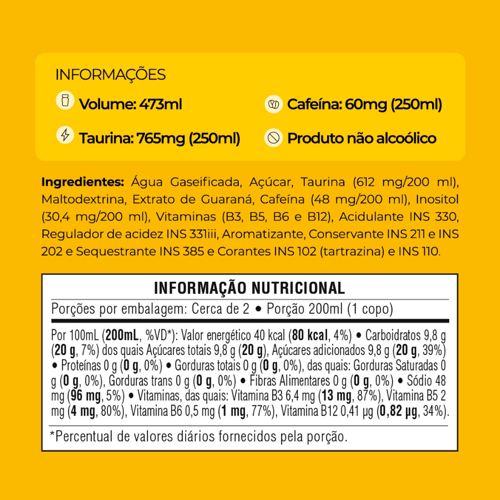Baly Tropical é a mistura de sabores que traz o gostinho brasileiro em um mix de frutas amarelas e frutas tropicais. Cada gole é como ter o verão o ano todo na lata, refrescante e cheio de intensidade. A Baly é a maior marca brasileira de energéticos, e o Tropical 473ml é o sabor que conecta energia e brasilidade. Com Taurina, Cafeína e Vitaminas do Complexo B, entrega disposição, foco e aquele gás que você precisa pra qualquer momento do dia. Seja na resenha com os amigos, pegando aquele solzão na praia, virando a noite no game ou encarando a semana de provas, Baly tá sempre com você! A lata de 473ml é perfeita pra compartilhar e dividir a energia com a galera. Inspirado nos ingredientes e gostos que fazem parte da nossa cultura, o Baly Energy Drink traz sabores que são a cara do Brasil. - Também disponível na versão Zero Açúcar - Produto não alcoólico