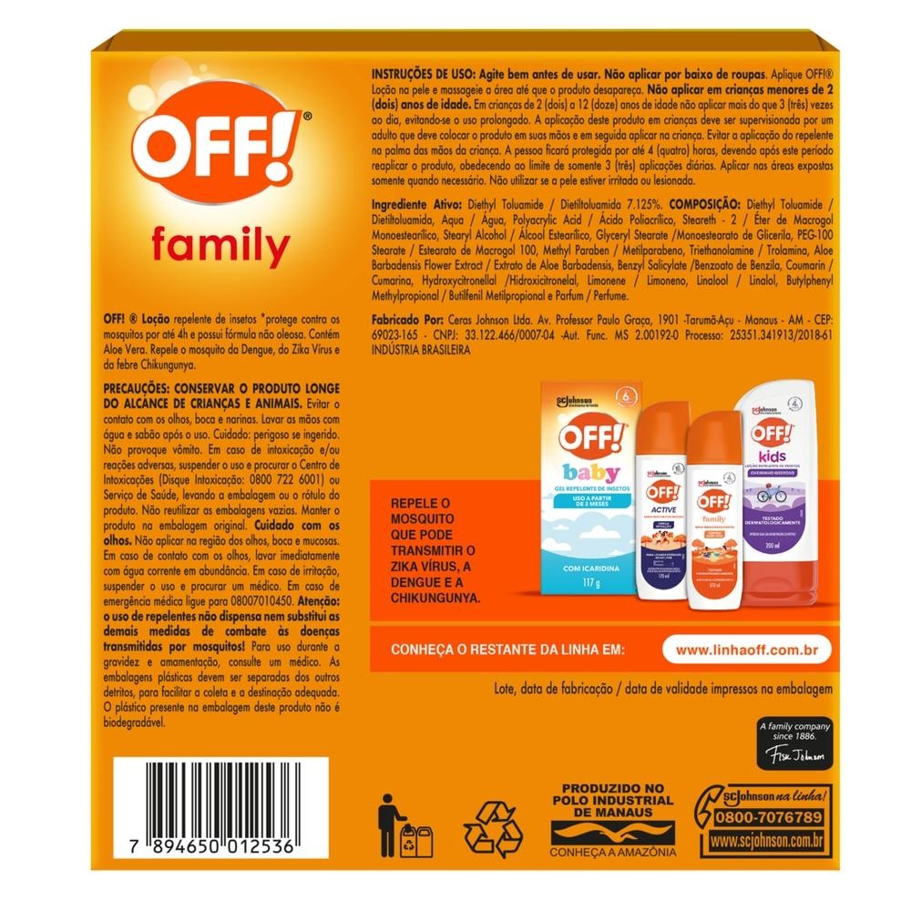 OFF Family Loção possui fórmula não oleosa, com aloe vera. Repele mosquitos que podem transmitir Zika, Dengue, Chikungunya e Febre amarela. Garante proteção por até 4h. Ideal para atividades ao ar livre. Pode ser usado por toda família (crianças acima de 2 anos de idade).