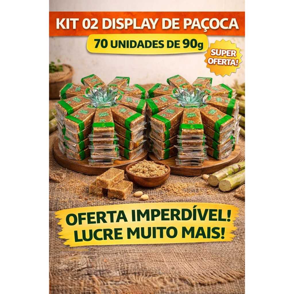 PAÇOCA CASEIRA DOCES LEO KIT COM 2 DISPLAYS COM 35 UN DE 90G CADA aparece na subcategoria Balas e Doces (de Alimentos e Bebidas) na Shopee Brasil por R$ 113,52 (29% de desconto sobre o preço original de R$ 159,89). Avaliado em 4.9/5 pelos compradores e 38 unidades vendidas, este produto se destaca pelo excelente custo-benefício.