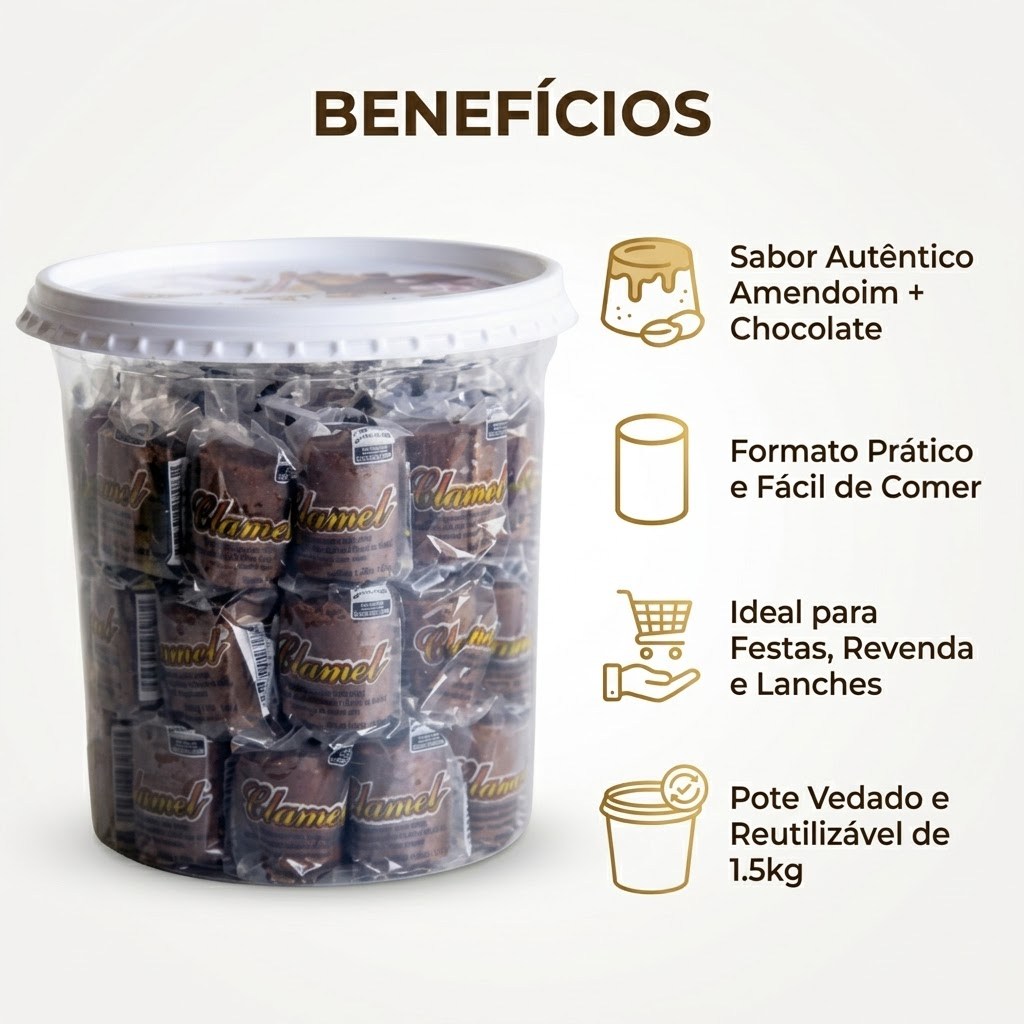 🍫 Paçoca com Chocolate Rolha Pote 1,5kg 50 Unidades 😍 Perfeita para festas, lanches e revenda Características do produto: ✅ Deliciosa paçoca com cobertura de chocolate 🍫🥜 ✅ Formato rolha, prático e fácil de consumir ✅ Pote com tampa vedada que mantém o frescor ✅ Contém aproximadamente 50 unidades ✅ Peso total de 1,5kg ideal para festas e revenda Você vai receber em sua casa: 📦 1 pote de Paçoca com Chocolate 📦 Aproximadamente 50 unidades 📦 Peso total: 1,5kg Recomendações de Uso: 👉 Armazene em local seco e fresco 👉 Ideal para festas, lembrancinhas e lanches 👉 Mantenha o pote bem fechado após abrir 👉 Evite exposição ao calor