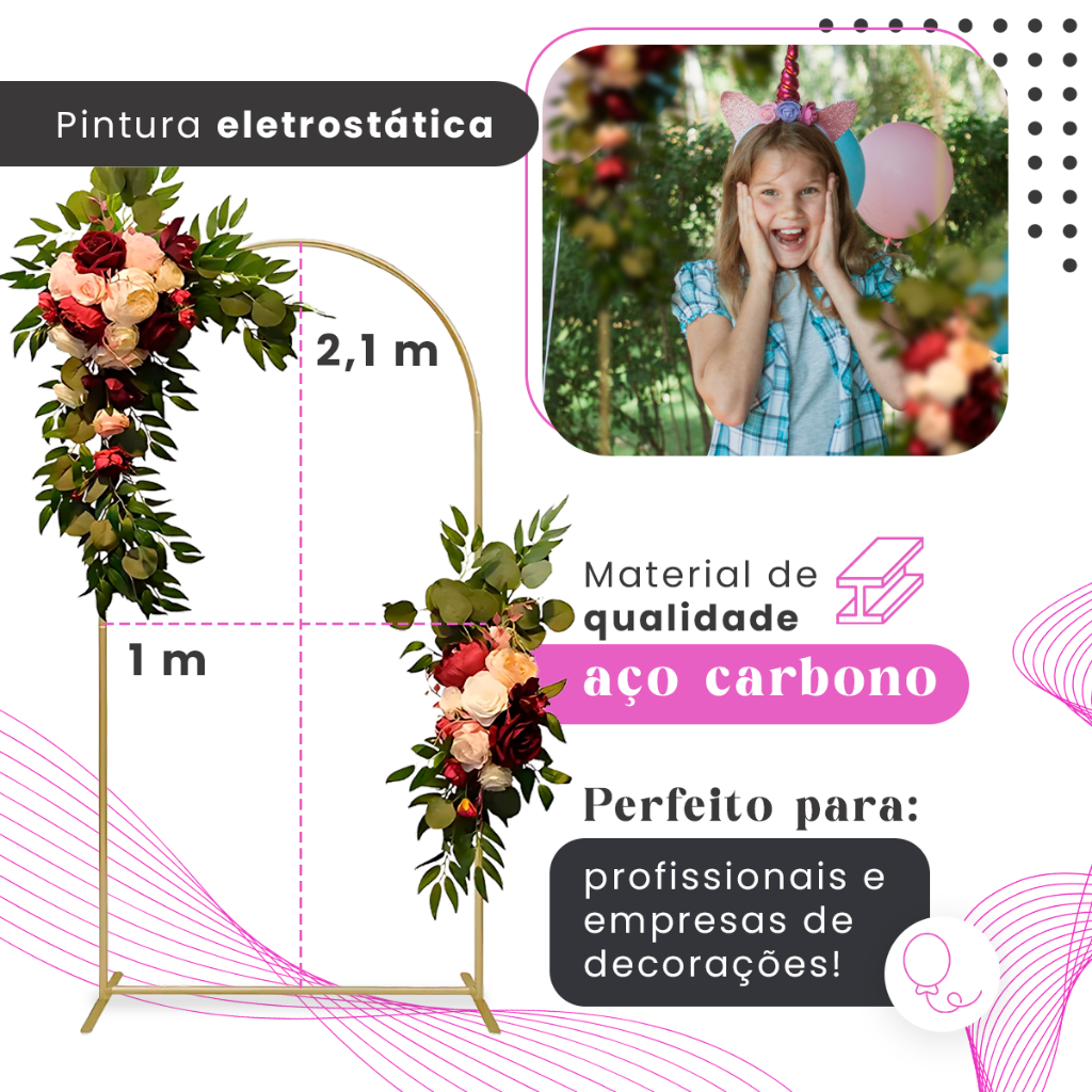 • Material resistente: Aço carbono com pintura eletrostática para durabilidade e acabamento impecável. • Tamanho ideal: 2 metros de altura por 1 metro de largura, desmontável para fácil transporte e montagem! • O arco é composto por 6 peças Cor: Dourada • Envio rápido: Pedidos finalizados até as 11h são enviados no mesmo dia. Tem dúvidas? Fale conosco pela caixa de mensagens — será um prazer ajudar você!