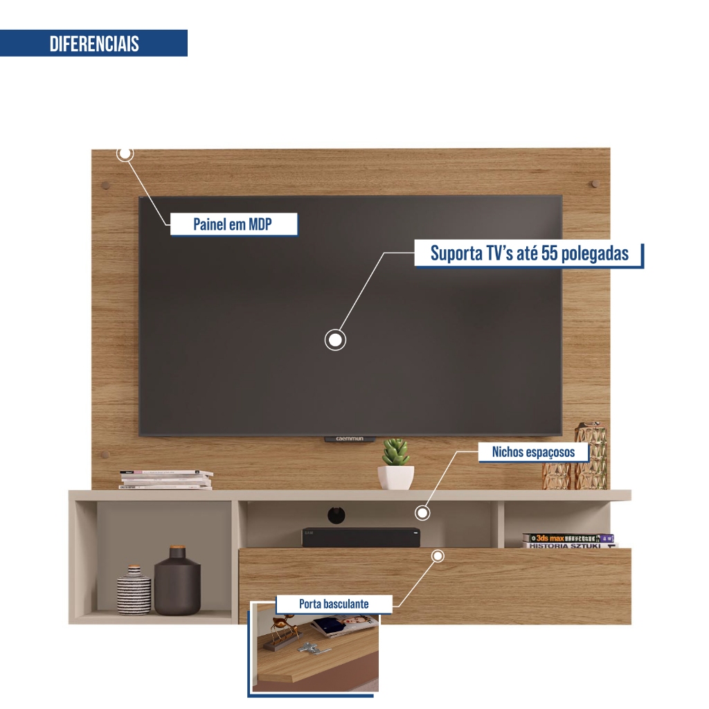 O Painel Bancada Black é ideal para completar seu ambiente, robusto, elegante e possui um design moderno e único. Suporta Televisores até 55 Polegadas 1 Porta com amplo espaço interno. Feito em MDP possui maior resistência e durabilidade, passando maior segurança ao móvel. Dimensões do Produto: Altura: 122,5 cm Largura: 136 cm Profundidade: 25,2 cm Peso: 32,98 kg - Possui 2 Nichos - Possui 1 Porta Basculante - Suporta Televisores até 55 Polegadas - Acompanha manual de montagem - Não Possui Suporte para Televisor - Contém furação para passagem de fios - Estrutura em MDP BP de 12mm, 15mm e 25mm de espessura - Tonalidade do Produto: Jatobá - Off White / Buriti - Off White / Preto (TX) Peso suportado: - Tampo 3kg - Porta 2kg - Painel 25kg - Nicho 1kg (cada) - Garantia 90 dias contra defeito de fabricação - Este móvel chegará em sua casa separado em 1 volume Dimensões da embalagem: (1 Volume) Altura: 10 cm Largura: 46 cm Comprimento: 142 cm Recomendações de limpeza: - Limpar com pano macio, seco ou úmido, sem uso de produtos abrasivos. Pois, podem trazer danos ao produto. Sobre a entrega: - As transportadoras contratadas, não realizam entregas em apartamentos. Realizando assim a entrega na portaria do prédio. *Produto segue desmontado, montagem por conta do comprador. *Imagens do produto são meramente ilustrativas.