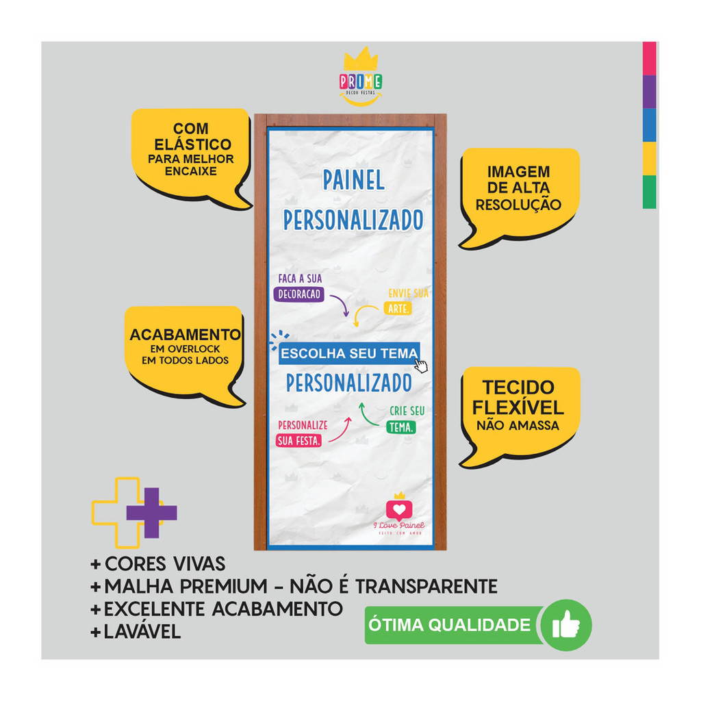 ⚠️ Atenção: Produto Personalizado! Após a compra, é necessário que nos envie as informações para personalização, pelo chat. O prazo de envio é de até 10 dias úteis após a compra. Quanto antes você nos enviar a arte, mais rápido seu pedido será produzido e enviado! ⚠️Caso não recebamos as informações, até a data de envio, o pedido será enviado sem personalização, para que o prazo de entrega seja mantido. Capa de Porta Personalizada Decorativa em Tecido Sublimado - 0,85m x 2,10m Transforme qualquer ambiente com nossa Capa de Porta Decorativa em Tecido Sublimado! Ideal para festas, eventos, escritórios e salas de aula, essa peça versátil e elegante é a escolha perfeita para quem deseja embelezar o espaço com estilo e praticidade. *PAINEL PERSONALIZADO - ENVIE SUA ARTE* *Envie sua arte em alta qualidade nos formatos JPG, PNG, PDF ou em arquivos de edição como Corel Draw, Photoshop, Illustrator, Canva e outros. Nossa equipe de especialistas garantirá que sua arte seja sublimada com perfeição para criar um painel sob medida que será o destaque da sua festa. Características: - *Tamanho:* 0,85m de largura x 2,10m de altura - *Acabamento a Laser:* Bordas perfeitas que evitam o desfiamento do tecido. - *Encaixe Perfeito:* Elásticos nas pontas garantem um ajuste firme e seguro na porta. - *Tecido Malha Premium:* Material com elástano, que não amassa e é macio ao toque. - *Fácil de Instalar:* Design veste-fácil com elástico, permitindo uma instalação rápida e sem complicações. - *Durabilidade:* Pode ser lavado e passado, mantendo sua beleza e qualidade por mais tempo. - *Sem Emendas:* Confeccionado em uma única peça para um acabamento impecável. Instruções de Lavagem: - Utilize sabão neutro. - Não torça o tecido. - Não utilize máquinas de lavar. - Seque ao avesso em baixa temperatura. - Evite exposição direta ao sol. Garantia: - Garantia contra defeitos de fabricação. Decore suas portas com elegância e praticidade usando nossa Capa de Porta Decorativa em Tecido Sublimado. Um toque de beleza que faz toda a diferença!