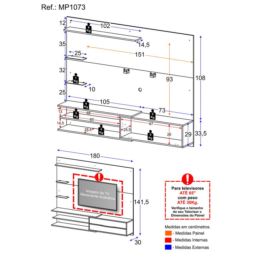 O Painel com Suporte para TV até 65 Polegadas 1 Porta e Prateleiras Multimóveis MP1073 é uma escolha inteligente e super em conta para deixar o seu ambiente bonito e organizado. Produzido em MDP, esse painel possui um acabamento acetinado (cerca de 20% de brilho), garantindo sofisticação ao ambiente. Com 1 porta basculante e 5 prateleiras, sendo duas delas em vidro resistente (suportando até 1kg), você terá espaço suficiente para organizar seus aparelhos eletrônicos e objetos decorativos favoritos. O puxador alongado em polipropileno adiciona um toque moderno ao design do móvel. Além disso, o painel para TVs de até 65 polegadas (suporta até 30Kg) possui espaçamento especial para a passagem dos fios, mantendo seu ambiente livre de cabos desorganizados. Para facilitar a sua vida, este produto acompanha também o kit para fixação da TV. Muito prático e de fácil instalação, pode ser utilizado para TV’s LCD, LED e plasma de 14” a 71”. Totalmente sobreposto, acompanha gabarito de montagem que auxilia na instalação. Conta com um sistema de encaixe rápido e possui 16mm de deslocamento que permite o ajuste do encaixe das peças. Prático e moderno para deixar sua sala de estar confortável para desfrutar do seu entretenimento favorito com estilo e funcionalidade incomparáveis. Conteúdo da Embalagem: 1 (um) Painel 1 (um) Kit com Suporte TV Kit Ferragem Manual de Montagem Dimensões do produto montado: Altura: 141,5cm | Largura: 180cm | Profundidade: 30cm Tamanho Painel TV: 151 x 93cm *Devido as variações de tamanho dos televisores no mercado, sugerimos que verifique as medidas da sua TV e compare com o painel antes de efetuar a compra. *Não recomendamos utilizar suporte de TV articulado. *Você pode consultar as medidas detalhadas na imagem técnica do produto. *As cores do produto podem sofrer variações de tonalidade de acordo com as configurações do seu dispositivo. Imagem meramente ilustrativa. Decoração e eletros não acompanham o produto. O produto será entregue desmontado e não disponibilizamos o serviço de montagem.
