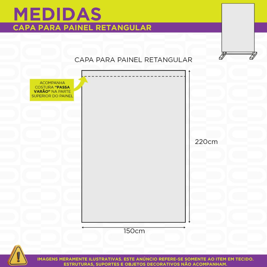 *** ATENÇÃO: NÃO FAZEMOS AJUSTES DE MEDIDA OU ARTE NOS PAINÉIS VERTICAIS RETANGULARES DESTE ANÚNCIO. VERIFIQUE AS MEDIDAS E MODELOS ANTES DE FINALIZAR A COMPRA *** >>> PAINEL RETANGULAR VERTICAL EM TECIDO 1,50x2,20 COM ACABAMENTO PASSA VARÃO NA PARTE DE CIMA, COM UTILIZAÇÃO EM ESTRUTURAS >>> PAINEL NÃO POSSUI EMENDA!!! ** ITEM INCLUSO: 1 Painel em Tecido Malha New medindo 1,50m de largura por 2,20m de altura ** Não acompanha qualquer item utilizado para demonstração de utilização do material com fotos reais. DETALHES DO PAINEL VERTICAL RETANGULAR EM TECIDO: + Tecido Malha New (Que estica e não amassa). + Tecido Leve com ótimo caimento + Gramatura: 140g/m de excelente qualidade. + Composição do Tecido: 95% Poliéster e 5% de Elastano. + Acabamento em overloque evitando que o cilindro desfie. + Acabamento passa varão para fixação do painel vertical retangular. BENEFÍCIOS DO PAINEL VERTICAL RETANGULAR: - Não reflete luz do flash - Pode ser lavado várias vezes - Pode ser passado a ferro - Fácil transporte e armazenamento - Não amassa com facilidade, ótimo caimento - Alta durabilidade - Não retém água, se molhar vai secar rapidamente - Não perde coloração A cor do Painel pode variar devido a configurações de brilho e contraste do monitor ou celular onde a imagem está sendo visualizada, também podem dar a impressão das cores serem mais ou menos vivas, mais ou menos intensas. Nosso material possui uma cor bem viva, bem vibrante. PRODUÇÃO E ENVIO: - TODOS OS PEDIDOS ACOMPANHAM NOTA FISCAL. - O painel retangular é enviado em até 1 DIAS ÚTEIS após pagamento aprovado. - Possui garantia contra defeito de fabricação. - O envio é feito em embalagem individual e com todo carinho. - Os prazos para entrega variam de acordo com o seu CEP, não nos responsabilizamos pelos prazos dados pela plataforma da Shopee. *** Tem alguma dúvida antes de finalizar sua compra? Envie uma mensagem para nós que ajudaremos você! Temos vários anos de experiência no mercado em itens sublimados. ***