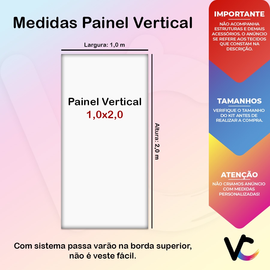 ITEM INCLUSO: - CAPA DE VERTICAL ROMANO EM TECIDO PREMIUM COM ELÁSTICO NA BORDA – Medida: 2,00 x 1,00. NÃO ACOMPANHA ESTRUTURA/SUPORTE - CAPA PAINEL VERTICAL EM TECIDO COM SISTEMA PASSA VARÃO – Medida: 1,00X2,00 - NÃO ACOMPANHA ESTRUTURA/SUPORTE. - CAPA PAINEL VERTICAL EM TECIDO PREMIUM COM SISTEMA PASSA VARÃO – Medida: 2,20x1,50 - NÃO ACOMPANHA ESTRUTURA/SUPORTE. *ATENÇÃO:* - NÃO FAZEMOS AJUSTE DE MEDIDA OU ARTE NOS ITENS DESTE ANÚNCIO. VERIFIQUE AS MEDIDAS ANTES DE FINALIZAR A COMPRA. ESPECIFICAÇÕES DO PRODUTO: IMPRESSÃO EM TECIDO PREMIUM DE ALTA GRAMATURA! POR QUE ESCOLHER NOSSO PRODUTO? * Impressão em alta resolução, garantindo cores vivas e imagens nítidas. * Tecido premium: não amassa, pode ser lavado e reutilizado inúmeras vezes. * Alta durabilidade: a estampa se mantém intacta enquanto o tecido existir. * Não reflete luz, garantindo fotos perfeitas em qualquer iluminação. * Leve e fácil de guardar: pode ser dobrado sem ocupar muito espaço. * Sem emendas, proporcionando um acabamento impecável. ______________ SOBRE OS EFEITOS ESTAMPADOS: Atenção! Nossos painéis possuem efeitos impressos que simulam glitter, madeira, folhagem, lantejoulas e texturas 3D. Não possuem elementos físicos como glitter real, folhas ou lantejoulas. Dúvidas sobre o efeito? Assista aos vídeos no anúncio! ______________ PERGUNTAS FREQUENTES: O PAINEL ACOMPANHA ESTRUTURA/SUPORTE? Não. O anúncio refere-se apenas à capa em tecido. POSSO USAR SEM ESTRUTURA? O modelo com elástico deve ser utilizado com suporte para melhor fixação e ajuste do painel. O modelo com sistema passa varão, Caso não tenha estrutura, pode ser utilizado diretamente na parede com fita dupla face grossa. FAZEM PERSONALIZAÇÕES? Ainda não realizamos alterações, trocas de imagem ou inclusão de nomes. QUAL O PRAZO DE ENVIO? Despachamos em até 24h úteis após a aprovação do pagamento. Em alguns casos, o envio ocorre no mesmo dia! O prazo de entrega varia conforme o CEP e é informado no ato da compra ou simulação do pedido. ACOMPANHA NOTA FISCAL? Sim! Todos os nossos produtos são enviados com Nota Fiscal. O PRODUTO TEM GARANTIA? Sim! Garantia contra defeitos de fabricação. ______________ Ainda tem dúvidas? Envie-nos uma mensagem! Não encontrou o tema desejado? Confira nossos outros anúncios ou solicite o link.