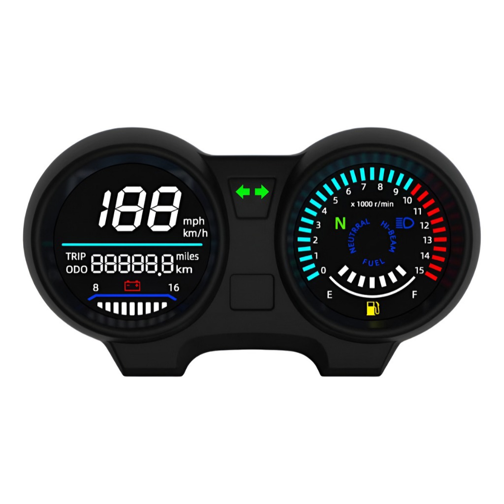 PAINEL DIGITAL PARA TITAN 150 - PAINEL COM O LED VERDE CONFORME NA FOTO. Compatível Titan 150 KS/ES 2004 à 2008. Titan 150 ESD 2004 à 2008. Titan 150 FAN 2011 à 2013. Titan 150 SPORT 1. Quilometragem: A quilometragem máxima ODO (quilometragem total) é a exibição máxima de 99999km, TRIP (quilometragem subtotal) A quilometragem indicada é de 999,9km, que pode ser alternada entre sistemas métricos e imperiais; 2. Velocímetro: A velocidade máxima é 199km/h, que pode ser alternada entre sistemas métricos e imperiais; 3. Luz indicadora: as luzes de sinal de volta esquerda e direita são VERDES, as luzes de feixe alto são AZUIS, indicador neutro a luz é VERDE, e a luz indicadora do medidor de combustível é VERMELHA; 4. Botão: alteração de milhas para km e resetar o trip. Atenção! Para assegurar o pleno funcionamento do produto e manter sua garantia válida, recomendamos enfaticamente que a instalação seja conduzida por um profissional habilitado. Isso não apenas preserva a garantia, mas também garante que o produto opere conforme projetado, oferecendo o máximo desempenho e durabilidade. Garantia de 90 DIAS PRONTA ENTREGA ENVIO IMEDIATO Nós NÃO nos responsabilizamos pelo mau uso do produto. Esperamos que esta compra possa atender às suas expectativas. Gostaríamos que você avalia-se o produto como uma classificação de CINCO ESTRELAS. Esperamos que retorne em breve! Se você tiver alguma dúvida, temos uma equipe pronta para atender e sanar todas elas.