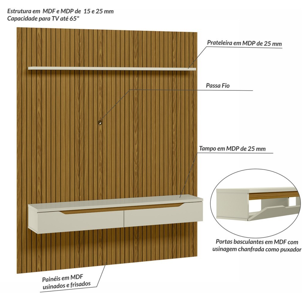 Descrição: O Painel Duetto Ripado Frizz é um produto com um design de frisos caracterizando o ripado, facilitando a limpeza e deixando-o mais clean. Sua estrutura é em MDF e MDP de 15 e 25 mm, possui uma prateleira de 25mm, e painéis em MDF frisados, possui passa fio para TV. É um painel na vertical com um nicho inovador com um tampo de 25 mm, três compartimentos e duas portas basculantes em MDF usinada como puxador. É um produto personalizando que deixa seu ambiente exclusivo. Características: - Formato do móvel: Painel - Polegadas: Acima de 47" - Garantia: 3 Meses - Volumes: 3 - Tamanho Máximo da Tv: Até 65 Polegadas - Recomendações de manutenção: Recomendado uso de pano umedecido. Não aplicar lustra móveis. - Tipo de Porta: Basculante - Quantidade de Portas: 2 - Produto Necessita de Montagem?: Sim - Peso do Produto Montado: 68,5Kg - Material da Estrutura: Mdp e Mdf - Escala de Brilho: Acetinado - Acabamento: Pintura UV - Peso Máximo Suportado: 32Kg - Medida do Produto Montado (LXCXA): 33cmX179,2cmX218cm