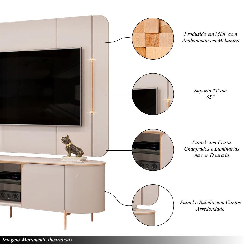 Painel e Bancada TV 65" 2 Portas Deep Luminárias Douradas Pés Metálicos OffWhite G18 - Gran Belo
