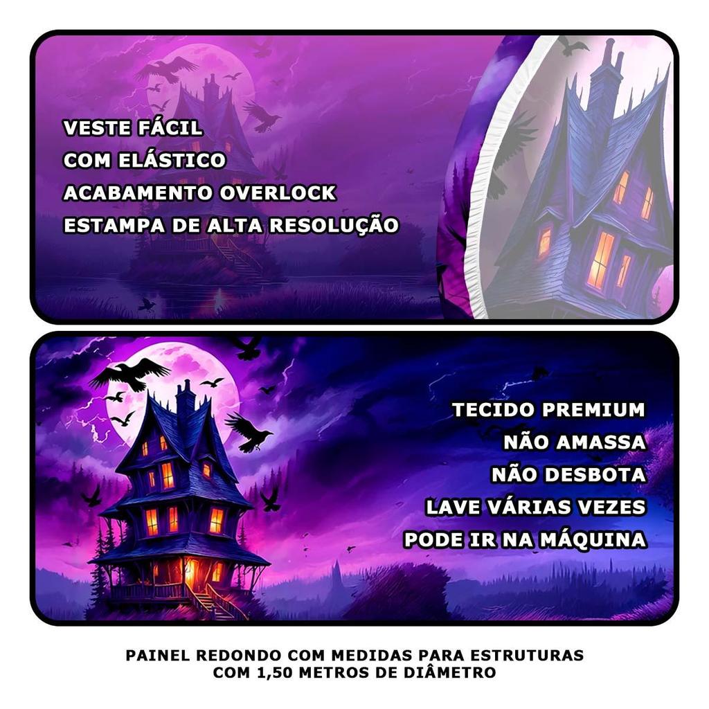 Itens inclusos:01 Painel Redondo em Tecido Premium Dimensões do produto: Largura: 1,50 m X Altura 1,50 m Especificações TécnicasMaterial: Tecido Sublimado Cor: Multicolorido Produto: Novo, na embalagem. Produto a pronta entrega! Produto original! Painel decorativo com tema de Casa Mal Assombrada diversos para Halloween. Painel redondo grande em tecido Premium elástico, sublimado por máquinas de alta qualidade, garantindo durabilidade, cores fortes e vivas, detalhes realistas e super destacados, não desbota, não encolhe e pode lavar várias vezes na máquina sem perder a sua qualidade. Seu tamanho tem o diâmetro perfeito para encaixar com facilidade em um suporte de 150 cm de diâmetro, seu elástico com acabamento costurado com overlock garante que ele não solte da estrutura, mas também é maleável o suficiente para vestir fácil no suporte. Tecido Premium Impressão de Alta Qualidade Durável, pode lavar muitas vezes Não Reflete o Flash Tecido não Amassa Secagem Rápida Veste Fácil Tamanho de 150 cm OBS: Acompanha apenas painel.