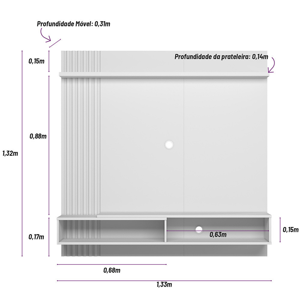 Procura um painel para TV compacto, funcional e que fique lindo em sua sala? O Painel Home Alvorada é o móvel ideal para você! Com espaço útil para acomodar TV de até 55 polegadas, possui uma prateleira superior e um nicho para decorações e aparelhos eletrônicos. Conta também com uma porta basculante para que você possa acomodar objetos que não precisam ficar à mostra. Os detalhes em ripado enriquecem ainda mais o Painel Home Alvorada e transmitem modernidade ao seu ambiente. Características: Marca: Linea Brasil Modelo: Painel Home Alvorada Espaço para TV no painel: 1,32 x 0,86 x 0,26m (LxAxP) Tamanho de TV recomendado : 55 polegadas Nicho: Possui 1 Porta: 1 porta basculante com espessura de 18mm Prateleira: 1 prateleira em MDP 25mm Tampo : Espessura de 15mm em MDP Passa fios : 2 Puxador : 1 puxador de plástico pontual Dobradiça : 2 dobradiças metálica Dimensões: Altura: 1,32 m Largura: 1,33 m Profundidade: 0,31 m Peso Bruto: 31,70 kg Dúvidas Frequentes: 1) Sobre a montagem do produto, o mesmo vem montado? O produto vai desmontado e quanto a montagem do mesmo, a Linea Brasil não possui tais serviço. Todos os produtos acompanham manual de montagem. Alguns produtos possuem vídeo de montagem no canal oficial da Linea Brasil no YouTube. 2) Quais são os itens inclusos do produto? As decorações são meramente ilustrativas e não acompanham o produto. 3) Esse produto é de fácil montagem? O produto possui complexidade média no quesito montagem. Recomendamos que seja montado por um profissional para melhor satisfação. 4) Qual o prazo de entrega? O prazo de entrega é estipulado de acordo com os prazos da transportadora parceira e CEP de destino. Você pode consultar o valor e prazo de entrega no próprio anúncio do produto. 5) O produto é enviado para todo o Brasil? Sim, entregamos em todo o Brasil, através de transportadoras parceiras. 6) Possui nota fiscal? Sim, todos os produtos da Linea Brasil são entregues com nota fiscal. 7) Qual a garantia do produto? Os produtos da Linea Brasil são garantidos por 90 dias contra defeitos de fabricação.