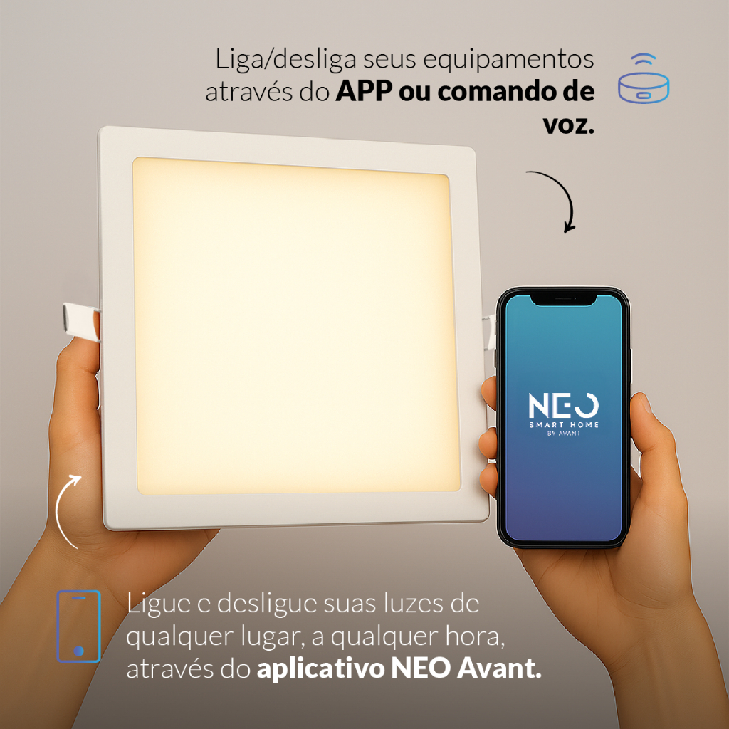 Lâmpada LED Smart Neo Avant - Iluminação Inteligente para Tetos Quadrados (Embutir) A Lâmpada LED Smart Neo Avant é a escolha ideal para quem busca uma iluminação inteligente e discreta para tetos quadrados, seja em sua sala de estar, quarto ou qualquer outro ambiente. Com tecnologia Wi-Fi, você controla a temperatura de cor de 2.700K a 6.500K, criando a atmosfera ideal para cada momento. PROPRIEDADES: Iluminação inteligente: Controle total da iluminação através do app Avant ou comandos de voz com Amazon Alexa e Google Assistente. Personalização: Ajuste a temperatura de cor de acordo com sua necessidade, desde um branco quente aconchegante até um branco frio ideal para trabalho. Eficiência energética: Economia de energia em comparação com lâmpadas tradicionais. Durabilidade: Vida útil de até 25.000 horas. Design moderno: Design elegante e discreto que se adapta a diversos estilos de decoração. CARACTERÍSTICAS DE FUNCIONAMENTO: Rede Wi-Fi: Frequência de 2.4 GHz. Bivolt automático: Funciona em 100V - 240V. IP20: Indicado para ambientes internos. ESPECIFICAÇÕES TÉCNICAS E COMERCIAIS (Item 290118076): Código: 290118076 Descrição Comercial: LED-PAINEL-NEO-EMB-QUA-22-AM2700K-BR6500K-18W-BIV Código de Barras: 7899452022431 Emissão de Luz: 2700K~6500K Fluxo Luminoso: 1260 lm GARANTIA: A Lâmpada LED Smart Neo Avant possui garantia oficial Avant de 12 meses para defeitos de fabricação. SOBRE A MARCA AVANT: A Avant é uma marca líder em soluções de iluminação, com foco na inovação e na busca constante por produtos de alta qualidade e tecnologia de ponta. A Avant se destaca por oferecer produtos inteligentes que facilitam o dia a dia e proporcionam mais conforto e praticidade aos seus clientes.