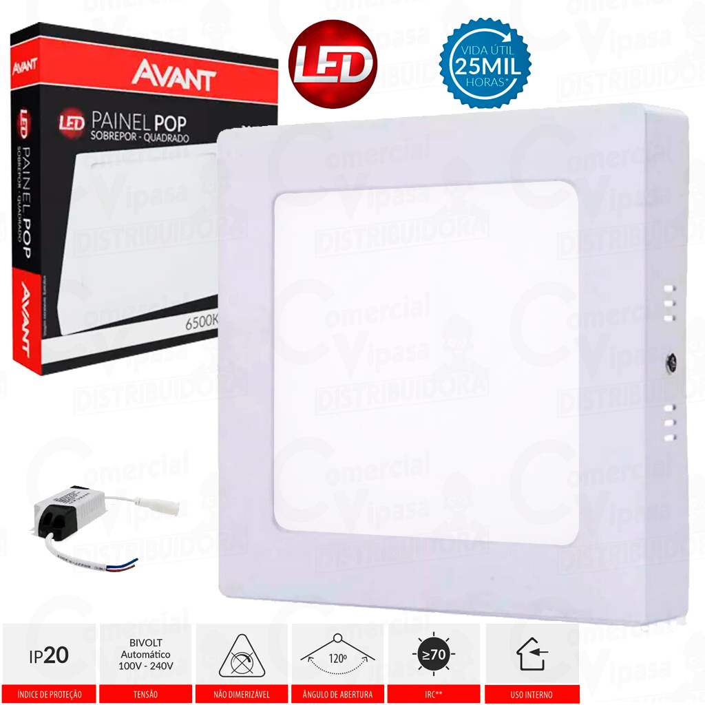 COMERCIAL VIPASA DISTRIBUIDORA. ANÚNCIO DE VARIAÇÃO Painel Led Plafon Quadrado Sobrepor 24W - 45W De Potência Branco Frio Design Moderno Avant Bivolt Características: – Corpo em alumínio – Fluxo luminoso: 2400lm – Temperatura de cor: 6500k – Branco frio – Possui transformador eletrônico isolado – Fluxo luminoso constante em toda faixa de tensão – Ângulo de abertura: 120° – IRC 70 – Tipo de instalação: Sobrepor – Temperatura ambiente: 5°C a 40°C – Tensão de entrada: 100V a 240V – bivolt – Fator de potência: 0,50. › Baixo consumo de energia – Produto não dimerizavel Na instalação do transformador eletrônico, certifique-se de que o mesmo não ficará em contato com a parte metálica da luminária que funciona como dissipador de calor, o que pode causar danos e interferências no funcionamento do transformador. COMERCIAL VIPASA DISTRIBUIDORA.