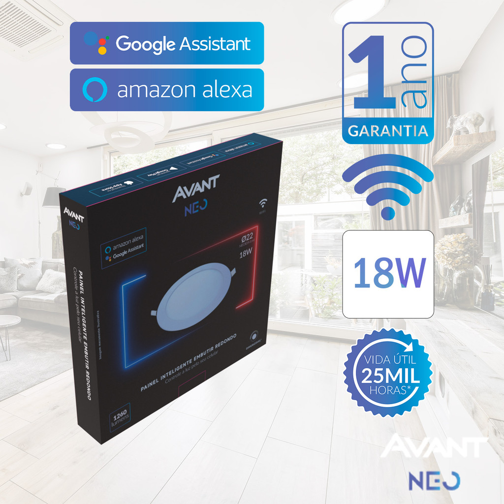 Painel led Plafon Smart Embutir 18w 2700k a 6500k 22cm 110v/220v Bivolt Redondo Branco Cod:290098071 Avant Neo A Lâmpada LED Smart Neo Avant é a escolha perfeita para quem busca uma iluminação inteligente e discreta para tetos redondos, seja em sua sala de estar, quarto ou qualquer outro ambiente. Com tecnologia Wi-Fi, você controla a temperatura de cor de 2.700K a 6.500K, criando a atmosfera ideal para cada momento. PROPRIEDADES: Iluminação inteligente: Controle total da iluminação através do app Avant ou comandos de voz com Amazon Alexa e Google Assistente. Personalização: Ajuste a temperatura de cor de acordo com sua necessidade, desde um branco quente aconchegante até um branco frio ideal para trabalho. Eficiência energética: Economia de energia em comparação com lâmpadas tradicionais. Durabilidade: Vida útil de até 25.000 horas. Design moderno: Design elegante e discreto que se adapta a diversos estilos de decoração. CARACTERÍSTICAS DE FUNCIONAMENTO: Rede Wi-Fi: Frequência de 2.4 GHz. Bivolt automático: Funciona em 100V - 240V. IP20: Indicado para ambientes internos. ESPECIFICAÇÕES TÉCNICAS E COMERCIAIS (Item 290098071): Código: 290098071 Descrição Comercial: LED-PAINEL-NEO-EMB-RED-22-AM2700K-BR6500K-18W-BIV Código de Barras: 7899452022417 Emissão de Luz: 2700K~6500K Fluxo Luminoso: 1260 lm GARANTIA: A Lâmpada LED Smart Neo Avant possui garantia oficial Avant de 12 meses para defeitos de fabricação. SOBRE A MARCA AVANT: A Avant é uma marca líder em soluções de iluminação, com foco na inovação e na busca constante por produtos de alta qualidade e tecnologia de ponta. A Avant se destaca por oferecer produtos inteligentes que facilitam o dia a dia e proporcionam mais conforto e praticidade aos seus clientes.