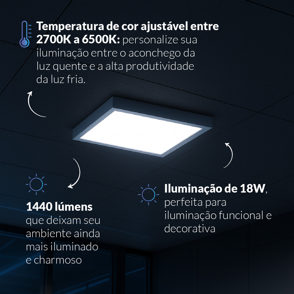 Eleve o nível da iluminação dos seus ambientes com o Painel LED Plafon Smart de Sobrepor da Avant Neo. Com um design quadrado e minimalista, ele se integra perfeitamente a qualquer decoração, oferecendo controle total para criar o clima ideal. Ajuste a temperatura da luz, do branco quente (2700K) ao branco frio (6500K), e controle tudo pelo seu smartphone ou por comando de voz, trazendo mais conforto e tecnologia para o seu lar ou escritório. PROPRIEDADES: Este painel de LED inteligente permite o controle total da iluminação de forma remota através do aplicativo Avant, disponível para Android e iOS. Você pode ligar, desligar, dimerizar e alterar a temperatura de cor da luz de onde estiver, utilizando apenas uma conexão Wi-Fi. A tecnologia LED de alta eficiência garante uma iluminação uniforme, com baixo consumo de energia e uma vida útil prolongada de até 25.000 horas. CARACTERÍSTICAS DE FUNCIONAMENTO: Projetado para uma instalação simples e prática (de sobrepor), o painel não exige grandes alterações na estrutura do teto. É compatível com redes Wi-Fi 2.4 GHz e funciona com Google Assistente, permitindo o controle por comandos de voz. Sendo bivolt automático, adapta-se a tensões de 100V a 240V, tornando-o versátil para diferentes locais como salas, cozinhas, quartos e corredores. ESPECIFICAÇÕES TÉCNICAS E COMERCIAIS: Potência: 18W Formato: Quadrado de Sobrepor Tensão: 100V - 240V (Bivolt automático) Dimensões: 22cm x 22cm Temperatura de Cor: 2700K (Branco Quente) a 6500K (Branco Frio) Vida Útil: 25.000 horas Conectividade: Wi-Fi 2.4 GHz Garantia Oficial da Marca de 12 meses para defeitos de fabricação. SOBRE A MARCA: A Avant Neo se destaca por oferecer soluções de iluminação que aliam tecnologia de ponta e inovação. Seus produtos inteligentes são desenvolvidos para proporcionar mais conforto, praticidade e modernidade ao dia a dia dos seus clientes.