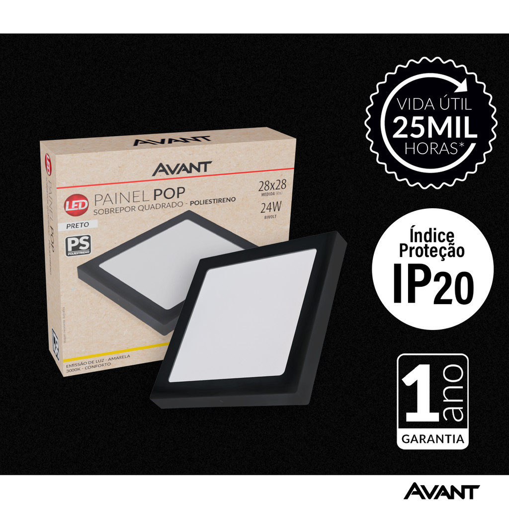 Painel Led Pop Quadrado Sobrepor 24W 3000k 28x28 Pr Avant