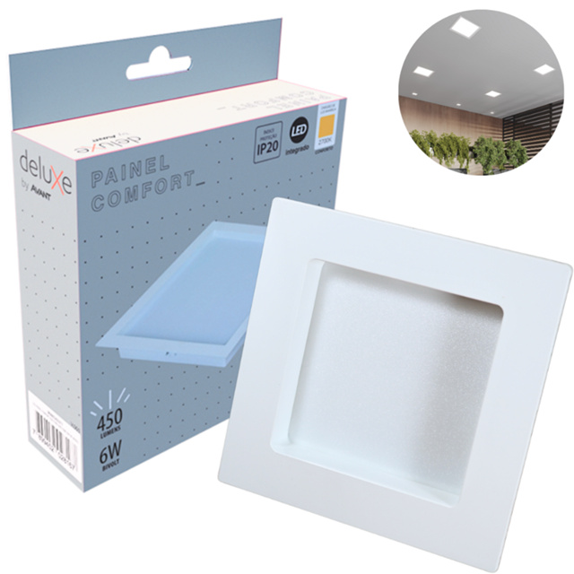 Painel Comfort Recuado - 6W Branco • Características: - Potência: 6W - Temperatura de Cor: Quente 2700K - Fluxo Luminoso: 450 lm - Material: Corpo e difusor em policarbonato - Acabamento: Branco - Tipo de Instalação: Embutir - Eficiência Luminosa: 75 lm/W - IRC: >70 - Ângulo de Recuo: 90° - Ângulo de Abertura: 100° - Tensão: Bivolt Automático 100V-240V - Proteção: IP20 (Uso interno) - Não dimerizável • Especificações Técnicas e Comerciais: - Código: 908020371 - Código de Barras: 7899452028167 - Dimensões (mm): A: 120, B: 120, C: 35 - Nicho de Corte (mm): 92x92 - Peso: 120g • Sobre a Garantia: O Painel Comfort possui garantia de 2 anos a partir da data da compra, desde que respeitadas as condições de uso descritas na embalagem. Para garantir a validade da garantia, apresente o Cupom ou a Nota Fiscal do produto. • Sobre o produto: Ilumine seus ambientes com um toque de aconchego e elegância! O Painel Comfort 6W Branco é a escolha perfeita para criar uma atmosfera relaxante e convidativa, ideal para salas de estar, quartos e outros ambientes. Sua luz quente e suave proporciona um ambiente acolhedor e relaxante. • Vantagens: - Design moderno e discreto, ideal para diversos estilos de decoração - Eficiência energética, economizando energia e dinheiro - Luz suave e uniforme, proporcionando um ambiente acolhedor - Fácil instalação e manutenção - Versátil, adaptando-se a diferentes necessidades de iluminação • Benefícios: - Ambiente mais aconchegante e convidativo - Economia na conta de energia - Maior durabilidade e segurança - Iluminação ideal para relaxar e descansar • Dica de uso: Combine o Painel Comfort com outros elementos decorativos como cortinas, tapetes e plantas para criar um ambiente personalizado e charmoso. • Ambientes aplicáveis: - Salas de estar - Quartos - Corredores - Halls - Banheiros - Escritórios • Sobre a Marca: A Deluxe é reconhecida por oferecer produtos de iluminação de alta qualidade, design inovador e foco na funcionalidade. A marca busca oferecer soluções completas e personalizadas, atendendo às necessidades dos clientes em diversos projetos.