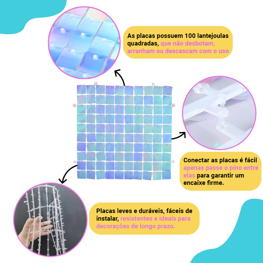 As Placas Shimmer Wall são a escolha ideal para transformar qualquer ambiente em um espaço deslumbrante. Cada placa mede 30x30cm e contém 100 lantejoulas de 2,8x2,8cm, proporcionando um efeito visual dinâmico e brilhante. Essas lantejoulas, feitas de plástico leve e resistente, refletem a luz de maneira espetacular, criando um efeito cintilante a cada movimento do ar. Contem: 20 Placas de Shimmer Wall Com um sistema de montagem simples, as placas são fáceis de conectar e instalar, sem necessidade de ferramentas. Você pode usá-las para criar painéis decorativos, cenários para fotos, ou backdrops de eventos, adicionando glamour e sofisticação. As placas são ideais para festas, eventos especiais, vitrines ou decorações de longa duração. Graças ao material plástico de alta qualidade, essas placas são duráveis, reutilizáveis e fáceis de armazenar após o uso. Seja para um evento temporário ou uma instalação fixa, as Placas Shimmer Wall oferecem uma solução prática, elegante e econômica