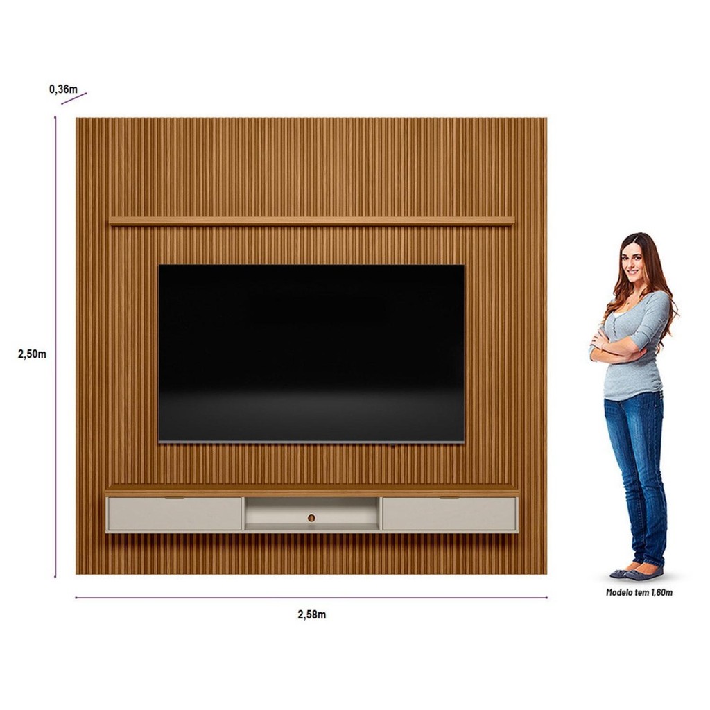 Descrição O painel Ripado Modular da Linea Brasil vem para criar uma nova forma de decorar seu ambiente. Esse conjunto de Painel Ripado modular possui uma prateleira em MDP para objetos decorativos, nicho para aparelhos eletrônicos e duas portas basculante com pistão a gás. Seu design clean deixará sua sala ainda mais moderna. Características: Medidas Altura: 2,50 m Largura: 2,58 m Profundidade: 0,36 m Peso bruto: 119,80 kg Informações Técnicas • Marca: : Linea Brasil • Modelo: : Painel Modular Ripado 2,60m com Nicho e Prateleira Espaço para TV no painel: 2,58m de de de profundidade Tamanho de TV recomendado no painel : 75 polegadas • Nicho: : 1 para aparelhos eletrônicos e decoração • Porta: : 2 portas basculantes em MDP • Prateleiras: : 1 prateleira MDP 37mm de espessura • Puxador: : 2 puxadores metálico Dimensões: Dúvidas Frequentes: Dúvidas Frequentes 1) Sobre a montagem do produto, o mesmo vem montado? O produto vai desmontado e quanto a montagem do mesmo, a Linea Brasil não possui tais serviço. Todos os produtos acompanham manual de montagem. Alguns produtos possuem vídeo de montagem no canal oficial da Linea Brasil no YouTube. 2) Quais são os itens inclusos do produto? As decorações são meramente ilustrativas e não acompanham o produto. 3) Esse produto é de fácil montagem? O produto possui complexidade média no quesito montagem. Recomendamos que seja montado por um profissional para melhor satisfação. 4) Qual o prazo de entrega? O prazo de entrega é estipulado de acordo com os prazos da transportadora parceira e CEP de destino. Você pode consultar o valor e prazo de entrega no próprio anúncio do produto. 5) O produto é enviado para todo o Brasil? Sim, entregamos em todo o Brasil, através de transportadoras parceiras. 6) Possui nota fiscal? Sim, todos os produtos da Linea Brasil são entregues com nota fiscal. 7) Qual a garantia do produto? Os produtos da Linea Brasil são garantidos por 90 dias contra defeitos de fabricação.