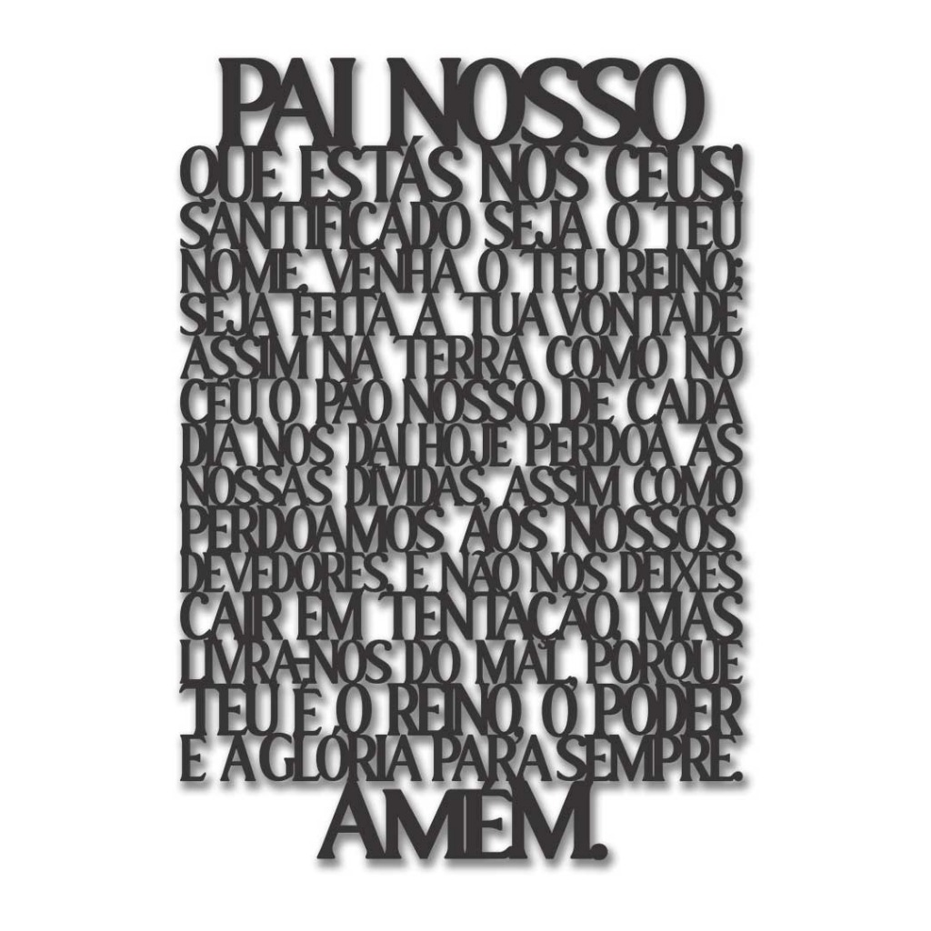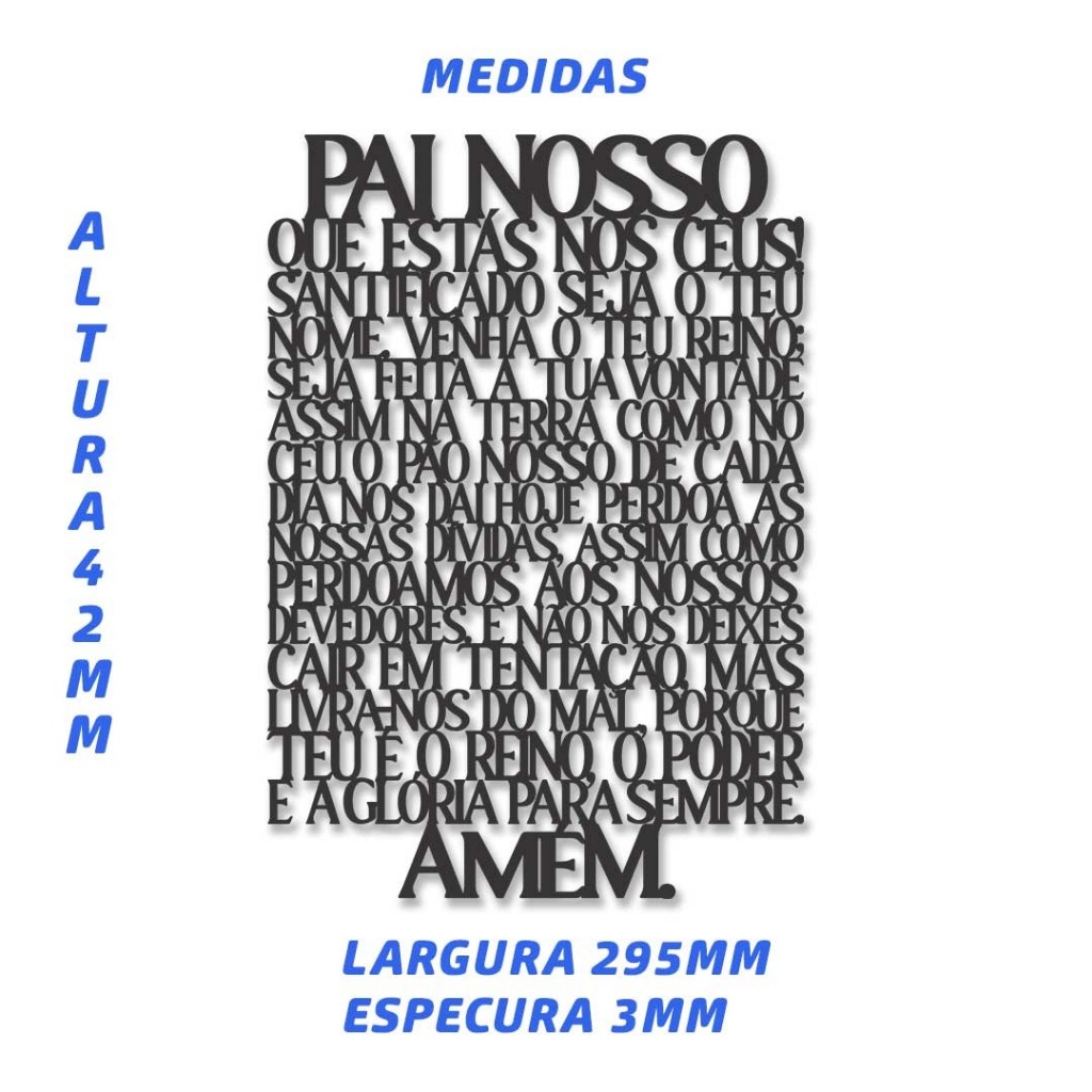 📦 Medida do Painel de Oração do Pai Nosso: - 42 cm de altura x 29,5 cm de largura - Material: Madeira MDF 3 mm Premium; - Cortada a laser; - Cores: Preto. Decore sua casa com o lindo Painel Oração Pai Nosso! Este quadro em MDF 3mm vazado destaca-se em qualquer ambiente, proporcionando um toque especial à sua decoração. O quadro possui um acabamento premium, sendo pintado de preto fosco e utilizando tinta à base de água da Suvinil, garantindo alta qualidade sem deixar cheiro. **Características:** - Acompanha dupla face para fácil instalação, sem a necessidade de furar a parede. - Quadro pintado de preto fosco. - Tinta à base de água da Suvinil, sem cheiro. - Fácil instalação com dupla face. - Material resistente em MDF 3mm. - Tamanho: 42 x 29,5 cm. **Como instalar:** 1. Limpe o local com um pano umedecido com água. 2. Retire o plástico da dupla face. 3. Cole na parede e pronto! **Especificações:** - Material: MDF 3mm **Garantia:** Produto bem embalado para garantir que chegue ao cliente em perfeito estado. Confira as fotos do anúncio para ver mais detalhes. Transforme seu espaço com esta peça de decoração única. Adquira já o seu! 💖 Sua Satisfação é Nosso Compromisso: A satisfação do cliente é nossa prioridade. Cada peça é criada com amor e dedicação, visando não apenas decorar, mas também encantar. Estamos aqui para tornar seus espaços mais especiais e memoráveis. OBS: O ENVIO E TOTAL E EXCLUSIVO DA PLATAFORMA SÃO ELES QUE ENCAMINHAM OS PRODUTOS PELA TRANSPORTADORA PRÓPRIA DELES !! * ESTE PRODUTO E UMA PRÉ-ENCOMENDA COM PRAZO PARA SEU ENVIO DE (5 DIAS UTÉIS)