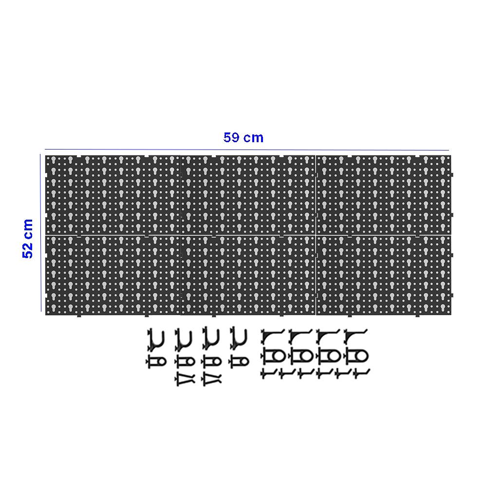 Painel Para Ferramentas Em Plástico Perfurado + Ganchos Foto 6 Apenas Ilustrativa - Não Acompanha Ferramentas O Painel Porta Ferramentas com Seis Unidades é ideal para organização e armazenamento das suas ferramentas no seu ambiente de trabalho. Prático, leve e de simples fixação. Organize seu ambiente de trabalho com o Painel Porta Ferramentas, com sistema de ranhura lateral para encaixe, permitindo a união de vários painéis e furos para fixação. - Dimensões do Painel Montado : 52cm de Altura x 59cm de Largura - Material: Plástico - Com sistema de ranhura lateral para encaixe, permitindo a união de vários painéis entre si - Furos para fixação com parafusos (Parafusos não inclusos) - Não acompanha ferramentas - Para a fixação de ferramentas - Indicado para uso em oficinas residência e muito mais - Peso Bruto: 600g Itens Inclusos: - 06 painéis 17,3cm x 29,5 cm ( Montado: 52cm de Altura x 59cm de Largura ) - 08 ganchos olhal - 04 ganchos curvos - 02 ganchos duplos - 10 ganchos retos Cores Disponiveis : Preto