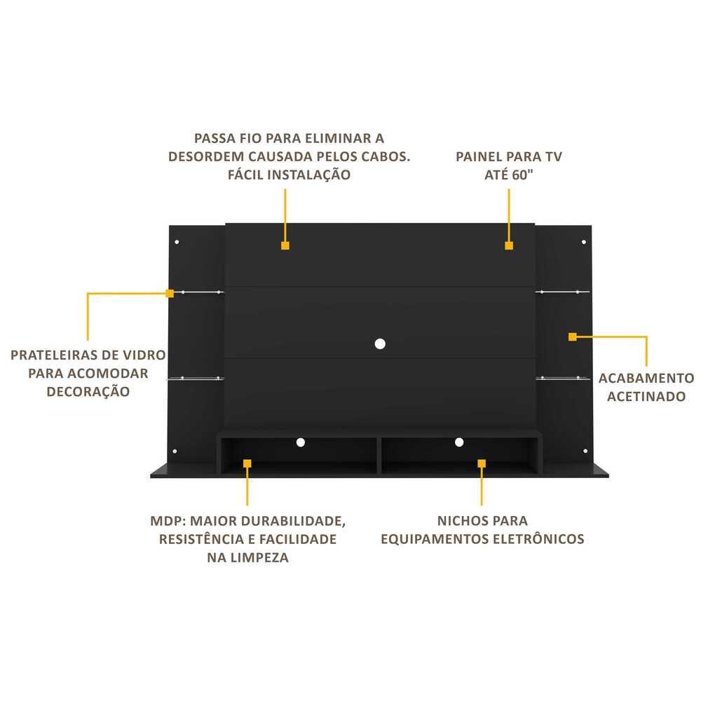 Prático e moderno para deixar sua sala de estar confortável para aproveitar o aconchego do seu lar. O Painel para TV até 60 polegadas com prateleiras de vidro Braga Multimóveis é uma escolha inteligente e super em conta para deixar o seu ambiente bonito e organizado. Produzido em MDP com acabamento acetinado, que garante maior durabilidade, resistência e facilidade na limpeza, o painel para TV de até 60” possui espaçamento para a passagem dos fios, o que deixa um visual clean e os cabos organizados. Possui 4 prateleiras em vidro, que deixam o móvel mais requintado e 2 nichos para acomodar os equipamentos eletrônicos. Conteúdo da Embalagem: 1 (um) painel para TV 4 (quatro) prateleiras de vidro Dimensões do produto montado: Altura: 108 cm - Largura: 191 cm - Profundidade: 31,5 cm Tamanho Painel TV: 90 cm x 136 cm *Devido as variações de tamanho dos televisores no mercado, sugerimos que verifique as medidas da sua TV e compare com o painel antes de efetuar a compra. *Você pode consultar as medidas internas na imagem técnica do produto. Disponível em 3 opções de cores: Nogueira - Branco - Preto Texturizado *As cores do produto podem sofrer variações de tonalidade de acordo com as configurações do seu dispositivo. Imagem meramente ilustrativa. Decoração e eletros não acompanham o produto. O produto será entregue desmontado e não disponibilizamos o serviço de montagem.