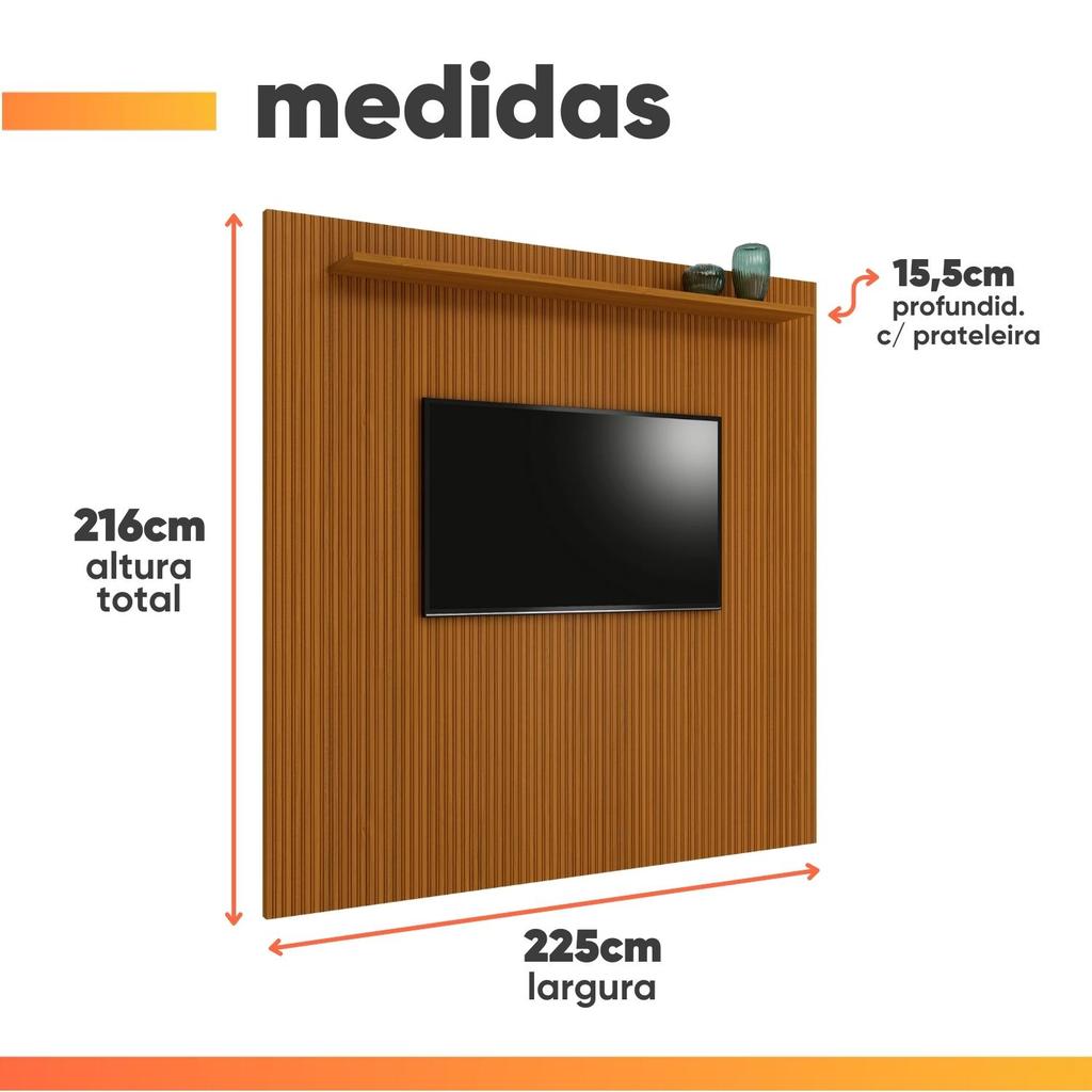 Quer ter sua sala com uma parede toda em detalhe ripado impressão 3D? O Painel para Tv Egeo com 2,25 m de largura, agregando beleza e elegância ao ambiente. Possui uma prateleira, ideal para acomodar objetos de decoração. Além de lindo e versátil, pode ser combinado com diversos outros móveis. Seu material de alta qualidade da resistência e durabilidade ao produto, é adequado para televisores de até 75 polegadas. MARCA: EDN COR: Cedro MEDIDAS: A: 216 cm L: 225 cm P: 15,5 cm (com prateleira) ACABAMENTO: Fosco PINTURA: UV MATERIAL: MDP 15 GAVETAS: Não possui PRATELEIRAS: 1 IDEAL PARA TV DE ATÉ: 75" Polegadas PESO: 57,75 Kg PRATELEIRA SUPORTA ATÉ: 3 Kg PAINEL SUPORTA ATÉ: 50 Kg ACOMPANHA: 1 painel, 1 manual de montagem e kit ferreagens. SISTEMA DE MONTAGEM: Girofix GARANTIA: 3 meses DIFERENCIAL: Ripado 3D e a prateleira do painel que pode ser instalada na parte superior ou inferior INSTRUÇÕES / CUIDADOS: Limpar com pano levemente umedecido com água e sabão neutro. Montagem não inclusa. Entregamos até a porta de entrada da casa do cliente ou até a portaria do condomínio.