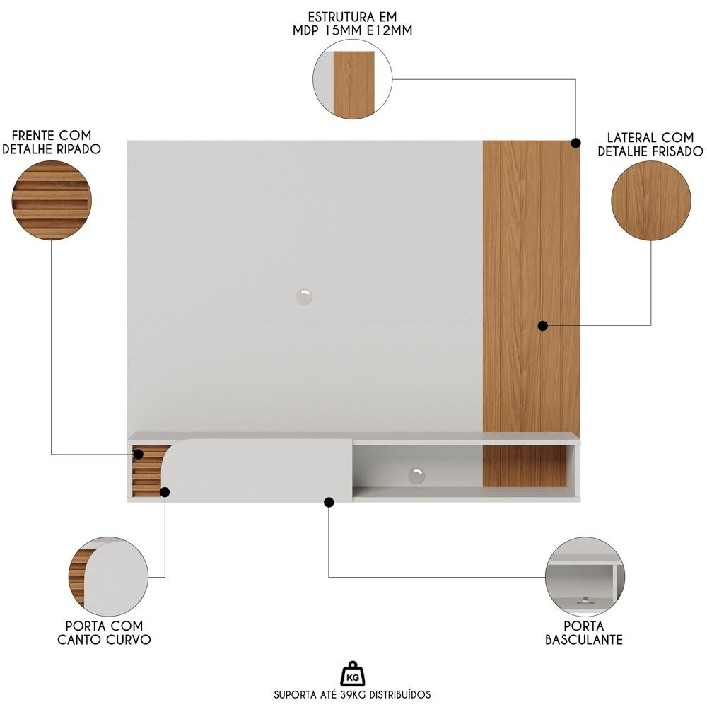 O Painel para TV 55 Pol com Bancada Madrid C05 Off White Matte/Freijó, da Mpozenato, é a escolha perfeita para elevar o estilo da sua sala de estar. Combinando perfeitamente o retrô e o contemporâneo, esse painel suspenso proporciona uma sensação envolvente, graças aos detalhes, como os apliques ripados e a porta de quina usinada. Além do design sofisticado, esse home suspenso também oferece funcionalidade, já que possui um nicho espaçoso, ideal para acomodar aparelhos eletrônicos e decorações, mantendo seu espaço organizado e elegante. O painel para TV comporta telas de até 55 polegadas e recebe destaque dos frisos laterais com acabamento em pintura PU, adicionando um toque refinado ao ambiente. Em outras palavras, esse painel com bancada suspensa se tornará o centro das atenções no seu ambiente. Renove seu espaço com essa peça que transcende o comum e adicione um toque de estilo único à sala de estar dos seus sonhos. Dimensões do Produto Largura: 136 cm. Altura: 108 cm. Profundidade: 28 cm. Peso: 25 kg. Outras Medidas Espaço para TV (L x A): 136 x 87,5 cm. Características do Produto Material da estrutura: MDP 15mm e 12mm/MDF 15mm e 12mm. Acabamento: Pintura UV. Escala de Brilho: Fosco. Peso Suportado: 39 kg distribuídos. Ideal para TV de até: 55 polegadas. Quantidade de Portas: 1 Porta. Tipo de Porta: Basculante. Tipo de Dobradiças: Metálicas. Possui Puxadores: Não. Possui Gavetas: Não. Possui Prateleiras: Não. Quantidade de Nichos: 1 Nicho. Possui Pés: Não. Possui LED: Não. Acompanha suporte para TV: Não. Diferenciais: - Design moderno. - Detalhe ripado na parte frontal da bancada e porta com canto curvo. - Painel com detalhe frisado. Sistema de Montagem: Parafusos/Cavilhas/Minifix. Manual de Montagem: Sim. Complexidade da Montagem: Média. Volumes: 1 Volume. Conteúdo da Embalagem: 1 Painel para TV. Garantia do Fabricante: 90 dias contra defeito de fabricação. Montagem: Recomendamos que seja feita por um profissional. Recomendação de Limpeza: Utilize pano levemente úmido. Observações importantes - Produto para uso residencial em ambiente interno, não devendo ficar exposto diretamente ao sol, calor e umidades excessivas. - Pode haver alguma diferença de tonalidade entre a imagem e o produto real, por conta do tratamento de imagens e a calibração de cores do seu monitor. - As imagens são meramente ilustrativas, não acompanham objetos de decoração e eletrônicos. - Confira o estado da embalagem, não devendo assinar o comprovante em caso de danos. - Não asseguramos, no ato da entrega, por subir escadas/elevadores, pelo transporte por guincho em apartamentos ou montagem, desmontagem e instalações. Eventuais despesas são por conta do comprador. - Confira as dimensões do produto e certifique-se de que passará normalmente por supostos elevadores, portas, escadas e/ou corredores de sua residência.