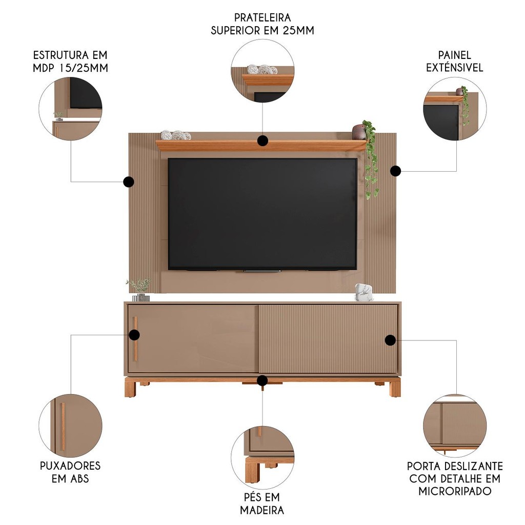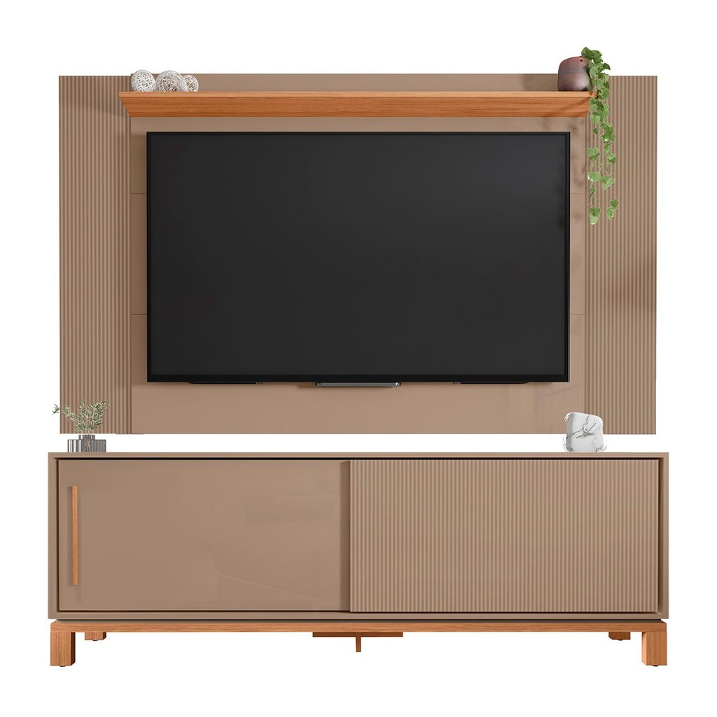 Painel Para TV 65 Pol e Rack Bancada 180cm Lucca Areia/Freijó C01 - Mpozenato Composto pelo Painel Extensível e a Bancada Para TV, duas peças que unem design sofisticado, funcionalidade e qualidade para criar um ambiente moderno e elegante. O Painel de TV é uma solução versátil, com medidas ajustáveis de 136cm a 180cm, perfeito para TVs de até 65 polegadas. Seu acabamento microripado, visível nas versões de 150cm e 180cm, traz um toque de sofisticação. Fabricado em MDP, oferece durabilidade e resistência, a prateleira de 25mm proporciona o espaço ideal para exibir objetos decorativos, podendo ser montada na parte superior ou inferior do painel. O Rack Bancada complementa o Painel com seu Design Moderno, incluindo duas portas deslizantes e gaveta com corrediças telescópicas. Uma das portas com acabamento microripado sem puxador traz um toque contemporâneo, enquanto a outra possui puxador em ABS. Combinando beleza, praticidade e qualidade, o conjunto transforma sua Sala De Estar em um ambiente sofisticado, funcional e alinhado com as últimas tendências de decoração. Garanta o seu agora mesmo! ESPECIFICAÇÕES Dimensão dos Produtos (L x A x P) Painel: 180cm x 108 cm x 17,5 cm. Bancada: 180 cm x 61,9 cm x 37,90 cm. Peso: 58,5 Kg. **Painel Extensível 136cm/150cm e 180cm. Características do Produto Material da Estrutura: MDP 15mm/25mm. Peso Suportado: 50 kg Distribuídos. Acabamento: Pintura UV. Escala de Brilho: Brilho/Fosco. Suporta TV de até: 65 Polegadas. Possui Prateleiras: Sim. Quantidade de Prateleiras: 3 Prateleiras. Possui Portas: Sim. Quantidade de Portas: 2 Portas. Tipo de Porta: Deslizantes. Possui Gavetas: Não. Possui Puxador: Sim. Material do Puxador: ABS. Possui Nicho: Não. Possui Pés: Sim. Material dos Pés: Madeira. Diferenciais: - Design moderno. - Prateleira 25mm montagem opcional. - Puxador na cor dos pés, em ABS. - Porta com detalhe microripado. - Painel Extensível, até 3 medidas. Sistema de Montagem: Cavilhas/Parafusos/Minifix. Manual de Montagem: Sim. Complexidade da Montagem: Média. Volumes: 2 Volumes. Conteúdo da Embalagem: 1 Rack, 1 Painel. Garantia do Fabricante: 90 dias contra defeito de fabricação. Montagem: Recomendamos que seja feita por um profissional. Recomendação de Limpeza: Utilize pano levemente úmido. Observações importantes: - Produto para uso residencial em ambiente interno, não devendo ficar exposto diretamente ao sol, calor e umidades excessivas. - Pode haver alguma diferença de tonalidade entre a imagem e o produto real, por conta do tratamento de imagens e a calibração de cores do seu monitor. - As imagens são meramente ilustrativas, não acompanham objetos de decoração e eletrônicos. - Ao receber a mercadoria, o cliente deve verificar as condições da embalagem, caso haja algum problema não assine o comprovante de recebimento. - Montagem, desmontagem e outras instalações serão de responsabilidade do cliente. Não nos responsabilizamos, no ato da entrega, por subir escadas/elevadores ou pelo transporte por guincho em apartamentos. Eventuais despesas são de responsabilidade do comprador. - Confira as dimensões do produto e certifique-se de que passará normalmente por supostos elevadores, portas, escadas e/ou corredores de sua residência.