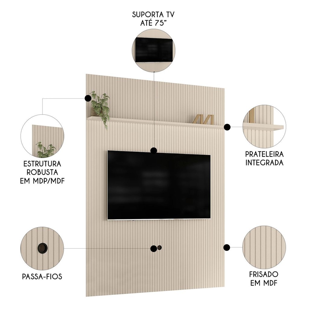 "O Painel Para TV 75 Polegadas 179cm Logus M01 Off White, da Mpozenato, é a escolha perfeita para quem busca modernidade e praticidade na composição da Sala de Estar. Desenvolvido para ser fixado diretamente na parede, o Painel de TV garante um visual limpo e organizado, sendo ideal para acomodar o TV's de até 75 Polegadas. Fabricado com chapas de MDP e MDF de 12 e 25mm, o Painel combina resistência e durabilidade, enquanto o acabamento frisado em MDF proporciona um design sofisticado que valoriza a decoração do ambiente. A prateleira integrada é ideal para acomodar objetos decorativos ou aparelhos eletrônicos, tornando o espaço funcional e elegante. Com um visual elegante, o Painel Frisado é a solução ideal para quem deseja otimizar o espaço, mantendo o ambiente harmônico e moderno. Não perca tempo, adicione já ao carrinho. ESPECIFICAÇÕES Dimensões do Produto Largura: 179 cm. Altura: 244 cm. Profundidade: 18 cm. Peso: 55 Kg. Características do Produto Material da estrutura: MDP/MDF. Espessuras das Chapas: 12mm/25mm. Acabamento: Pintura UV. Escala de Brilho: Brilho/Fosco. Peso Suportado: 38 kg. Suporta TV de até: 75 Polegadas. Possui Portas: Não. Possui Gavetas: Não. Possui Prateleiras: Sim. Quantidade de Prateleiras: 1 Prateleira. Possui Puxador: Não. Possui LED: Não. Possui Nicho: Não. Possui Passa-Fios: Sim. Diferenciais: - Painel frisado em MDF. - Suporte para TVs de 75 polegadas. - Passa-fios. Sistema de Montagem: Parafusos/Cavilhas. Manual de Montagem: Sim. Complexidade da Montagem: Média. Volumes: 2 Volumes. Conteúdo da Embalagem: 1 Painel. Garantia do Fabricante: 90 dias contra defeito de fabricação. Montagem: Recomendamos que seja feita por um profissional. Recomendação de Limpeza: Utilize pano levemente úmido. Observações importantes - Produto para uso residencial em ambiente interno, não devendo ficar exposto diretamente ao sol, calor e umidades excessivas. - Pode haver alguma diferença de tonalidade entre a imagem e o produto real, por conta do tratamento de imagens e a calibração de cores do seu monitor. - As imagens são meramente ilustrativas, não acompanham objetos de decoração e eletrônicos. - Confira o estado da embalagem, não devendo assinar o comprovante em caso de danos. - Não asseguramos, no ato da entrega, por subir escadas/elevadores, pelo transporte por guincho em apartamentos ou montagem, desmontagem e instalações. Eventuais despesas são por conta do comprador. - Confira as dimensões do produto e certifique-se de que passará normalmente por supostos elevadores, portas, escadas e/ou corredores de sua residência."