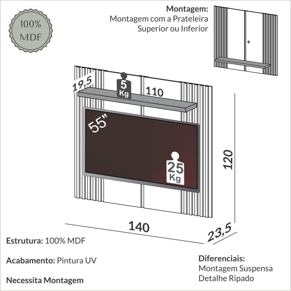 Descrição: Com design atemporal, o Painel Suspenso PA17 confere beleza e funcionalidade para qualquer sala de estar. Esse produto 100% MDF possui uma prateleira para acomodar aparelhos eletrônicos.Bonito e versátil, esse painel suspenso acomoda uma TV de até 55 polegadas e tem design moderno. Com pintura de 6 camadas de proteção, a alta qualidade do acabamento faz com que esse produto da Dalla Costa se destaque em qualquer espaço. OBS: Esse produto já acompanha os suportes necessários para a fixação na parede. Características: - Tipo do Móvel: Painel - Possui Pés?: Não - Possui Rodízios ?: Não - Escala de brilho: Fosco e Brilho - Tipo: Lojista - Material da Estrutura: MDF - Garantia (dias): 180 - Sistema de Montagem: Parafusos, cavilhas e Minifix. - Grau de Dificuldade da Montagem: Médio - Como os Móveis Chegarão na Minha Casa: Desmontado em caixas, acompanhado de todas as peças, ferragens e manuais para montagem. - Indicação de Uso: Sala de Estar - Observação: Objetos decorativos que aparecem nas imagens, não acompanham o produto. - Recomendação de Manutenção: Para conservar a cor e os aspectos originais do produto, leve em consideração: Levantar a peça ao deslocá-la, o que ajuda a evitar danos à base e aos pés; Não utilizar água em abundância na peça, somente um pano levemente umedecido para a limpeza ou um espanador seco; Utilizar panos preferencialmente brancos, para evitar manchas e seque bem o móvel após a limpeza; Utilize somente água, nunca produtos químicos, abrasivos, solventes, ceras, sabonetes não neutros ou produtos de limpeza doméstica, visto que podem danificar o acabamento; Não coloque objetos quentes diretamente em cima do móvel para não causar bolhas, manchas ou outros danos, opte por utilizar um apoio; Se possível, não exponha sua peça diretamente ao sol, utilize cortinas ou persianas para bloquear os raios de luz, para que a pintura não desbote. Esses cuidados são muito simples e auxiliarão seu produto a permanecer em perfeito estado por muitos anos. - Revestimento /Acabamento: Pintura UV - Espessura da Estrutura: 9 mm, 18 mm, 6 mm, 15 mm, 38 mm - Ideal para TVs até: 55 Polegadas - Medidas do Painel (A x L x P): 120 x 140 x 23,5 cm - Quantidade de Prateleiras: 1 - Peso Suportado nas Prateleiras: 10 Kg - Linha: Ripado - Necessita de Montagem: Sim - Possui Gavetas?: Não - Acompanha LED: Não - Acompanha Suporte para TV: Não - Necessita de Fixação na Parede?: Sim - Possui Furação para Passagem de Cabos: Sim - Possui Vidro?: Não - Possui Portas?: Não - Possui Espelho?: Não - Possui Prateleiras?: Sim - Possui Puxadores?: Não - Pode Ser Montado Invertido?: Sim