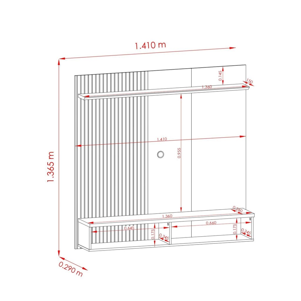Produto desenvolvido para ser fi xado na parede. O televisor deve ser fi xado no painel. Porta basculante com dobradiças metálicas, painel lateral em MDF frisado (baixo relevo), puxador com acabamento dourado fosco e revestimento que simula couro natural, prateleira superior com borda chanfrada, painéis em MDP e MDF de 1,2, 1,5 e 2,5. Peso (kg): 36.8 Garantia: 03 Meses Altura (cm): 136.5 Acabamento: Pintura UV Largura (cm): 141 Possui Pés: Suspenso Possui Nichos: Não Possui Portas: Sim Possui Gavetas: Não Suporta Até (kg): 36 Possui Espelhos: Não Profundidade (cm): 29 Escala de Brilho: Semi-Brilho Acabamento Ripado: Frisado Origem do Produto: Nacional Possui Iluminação: Não Ambiente Principal: Sala de Estar Material Principal: MDF/MDP Tipo de Puxador da Porta: Embutido Peso Máximo por Prateleira: 3 Ideal para TVs até (Polegadas): 55 Marca: Madetec Cor: Cumaru Cor do Produto: Cumaru Itens Inclusos: 1 bancada Cor Predominante: Marrom Quantidade de Portas: 1 Porta