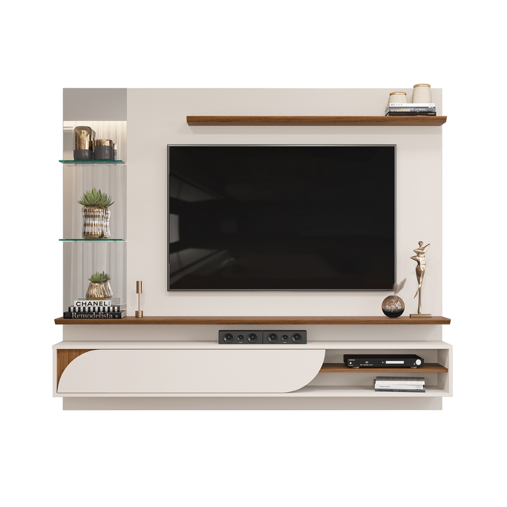 O Painel Ravi é ideal para ambientes compactos, este painel pode ser a estrela da sala de estar ou até mesmo dormitórios e áreas de lazer, sendo um produto totalmente versátil. Este produto foi desenvolvido para suportar TVs de até 60”. Não se esqueça que a resistência do painel Ravi é de até 40Kg, então fique de olho na hora de comprar sua TV. Este produto necessita de fixação na parede. Aproveite sua prateleira superior chanfrada e sua torre de espelhos com prateleiras de vidro para dispor seus objetos de decoração. Este produto conta com uma porta basculante com cantos curvos, oferecendo um espaço mais escondido para guardar objetos de forma organizada. Ao lado desta porta temos um nicho com uma prateleira onde você pode manter seus eletrônicos com fácil acesso. Este painel é produzido em MDF e MDP, que são chapas de madeira reconstituída advindas de reflorestamento. Dimensões: ( LxAxP ) 180 x 152,7 x 29,2 cm Conteúdo da Embalagem: Painel Ravi e manual de montagem Este móvel chegará em sua casa separado em 3 volumes Peso total do produto com embalagens 57,30 Kg Características Técnicas Porta basculante curva Prateleira superior e inferior chanfrada de 2,5 cm Torre de espelhos com 2 prateleiras de vidro Suporta TV's de até "60" polegadas medindo até (LxA) 149,8x90,4cm Peso máximo que o painel suporta 40Kg Observações: Imagens meramente ilustrativas (não acompanha os itens de decoração). As cores do produto podem variar de acordo com monitor e iluminação do ambiente. A DJ Móveis não se responsabiliza pelo serviço de montagem, o produto é enviado desmontado. Produto NOVO, manual de montagem e todos os acessórios necessários para a montagem completa do produto. Perguntas Frequentes: O produto é enviado montado? Todos os produtos da DJ Móveis são enviados desmontados, não realizamos a montagem dos produtos. O produto é novo ou usado? Todos os produtos da DJ Móveis são novos, você receberá o produto novo saindo direto da nossa fábrica. Posso retirar o meu produto em alguma loja física? Não possuímos lojas físicas para retirada de produtos. Qual é o valor do frete? O valor do frete é calculado com base no peso, volume e CEP de destino. Calcule o valor e o prazo de entrega para o seu CEP diretamente no simulador de frete do site. O produto é entregue em qualquer local do Brasil? Sim, entregamos em todo o Brasil através de nossos parceiros logísticos. O produto possui garantia? Sim, todos os produtos da DJ Móveis possuem garantia de 6 meses. Manutenção e Limpeza: Para manter seu móvel novo por muito mais tempo, evite locais úmidos, mantenha-o distante de líquidos e de fontes de calor. Evite a exposição prolongada ao sol. Para limpá-lo utilize uma flanela seca sem produtos abrasivos. Verifique a qualidade de sua parede antes de fixar qualquer móvel nela.