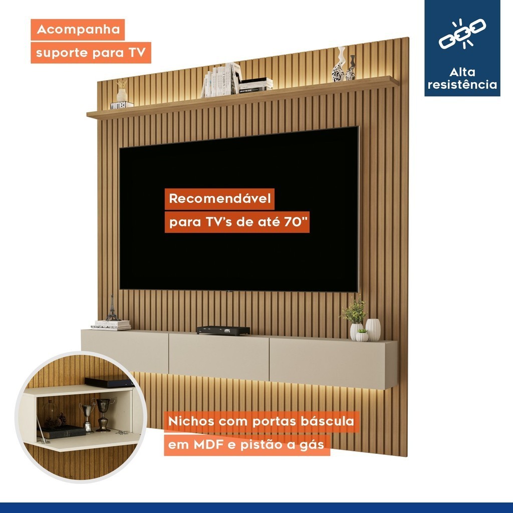 om um design sofisticado, o Painel para TV até 70 Polegadas Frisado com Led Duplo 3 Portas Curitiba é perfeito para quem busca funcionalidade e funcionalidade. Seu painel com led embutido proporciona um toque moderno e iluminado ao ambiente, enquanto as 3 portas oferecem excelente espaço para armazenar eletrodomésticos, acessórios e objetos decorativos. Ideal para TVs grandes, esse painel transforma sua sala em um ambiente estiloso e organizado, agregando conforto e sofisticação. O painel tem iluminação? Sim, ele conta com LED duplo, trazendo um toque moderno e iluminado ao seu ambiente. Ele oferece espaço de armazenamento? Sim, com 3 portas, o painel oferece bastante espaço para eletrônicos e acessórios. Estilo: Moderno Garantia: 03 Meses Altura (cm): 218 Acabamento: Pintura UV Largura (cm): 179 Possui Pés: Suspenso Possui Vidro: Não Possui Nichos: 2 Possui Portas: Sim Tipo de Porta: Basculante Possui Gavetas: Não Possui Tomadas: Não Suporta Até (kg): 70 Possui Espelhos: Não Profundidade (cm): 36.5 Escala de Brilho: Fosco Acabamento Ripado: Frisado Acompanha Lâmpada: Não Origem do Produto: Nacional Possui Iluminação: Sim Ambiente Principal: Sala de Estar Material Principal: MDF/MDP Possui Prateleiras: Sim Tipo de Puxador da Porta: Embutido Peso Máximo por Prateleira: 10 Informações Complementares (Novo): As tv's podem apresentar variações em suas carcaças de acordo com a marca, portanto meça a TV e veja se a medida do espaço deixado no produto é compatível com o aparelho. " Acompanha fitas de Led " Suporte de TV Universal Incluso: Sim Marca: Valdemóveis Cor: Cinamomo Cor do Produto: Cinamomo/Off White Itens Inclusos: 1 Estante Home, Kit Ferragens e Manual de Montagem. Cor Predominante: Marrom Quantidade de Prateleiras: 01 Prateleira