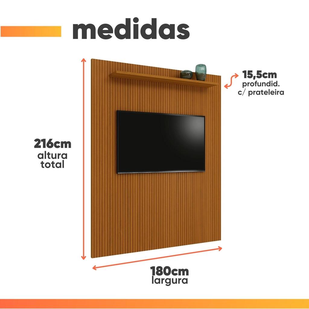 Quer ter sua sala com uma parede toda em detalhe ripado impressão 3D? O Painel para Tv Egeo com 1,80 m de largura, agregando beleza e elegância ao ambiente. Possui uma prateleira, ideal para acomodar objetos de decoração. Além de lindo, pode ser combinado com diversos outros móveis. Seu material de alta qualidade da resistência e durabilidade ao produto, é adequado para televisores de até 75 polegadas. MARCA: EDN COR: Cedro MEDIDAS: A: 216 cm L: 180 cm P: 15,5 cm (com prateleira) ACABAMENTO: Fosco PINTURA: UV MATERIAL: MDP 15 GAVETAS: Não possui PRATELEIRAS: 1 IDEAL PARA TV DE ATÉ: 75" Polegadas PESO: 45,55 Kg PRATELEIRA SUPORTA ATÉ: 3 Kg PAINEL SUPORTA ATÉ: 50 Kg ACOMPANHA: 1 painel, 1 manual de montagem e kit ferragens. SISTEMA DE MONTAGEM: Girofix GARANTIA: 3 meses DIFERENCIAL: Ripado 3D e a prateleira do painel que pode ser instalada na parte superior ou inferior INSTRUÇÕES / CUIDADOS: Limpar com pano levemente umedecido com água e sabão neutro. Montagem não inclusa. Entregamos até a porta de entrada da casa do cliente ou até a portaria do condomínio.