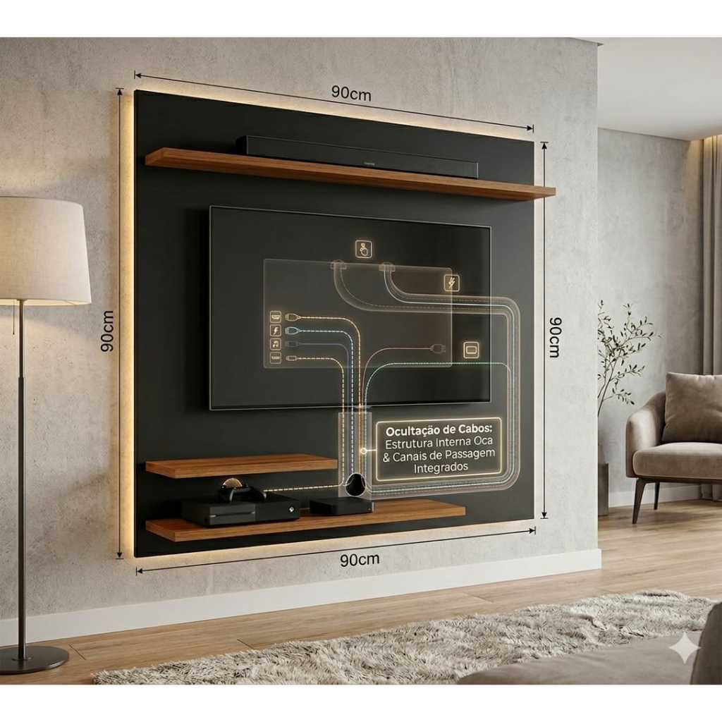 🖥️ Painel para TV Suspenso com Prateleiras – Moderno e Funcional Deixe sua sala mais elegante e organizada com este painel para TV com design moderno e funcional. Ideal para quem busca praticidade sem abrir mão da estética, ele valoriza o ambiente e mantém os equipamentos organizados. ✨ Destaques do Produto: ✔ Design moderno e versátil ✔ Sistema passa-cabos ✔ Cabos totalmente escondidos atrás do painel ✔ Prateleiras ideais para eletrônicos e decoração ✔ Disponível em várias cores (escolher na variação do anúncio) 📏 Medidas do Produto: Altura: 90 cm Largura: 90 cm Profundidade das prateleiras: 20 cm 🔌 Organização e Acabamento O painel possui sistema passa-cabos, permitindo que todos os fios da TV e aparelhos fiquem escondidos atrás do painel, deixando o ambiente mais limpo, sofisticado e organizado. 🎨 Cores Disponível em várias cores. O cliente deve selecionar a cor desejada no momento da compra, na aba de variações. Observação: As cores das imagens podem sofrer pequenas variações de acordo com as configurações de tela do dispositivo utilizado para visualização. ⚠️ Informações Importantes Produto enviado desmontado. Não nos responsabilizamos pela montagem.