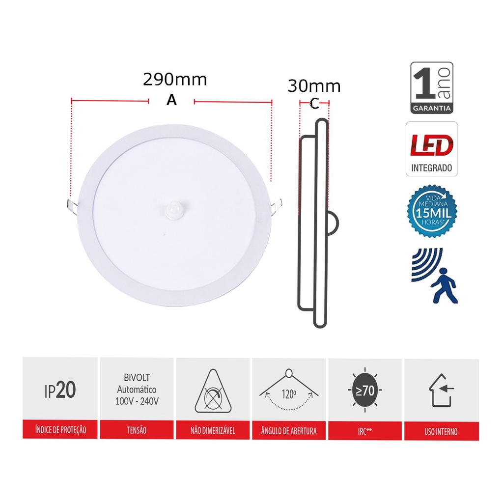 Painel Pop com Sensor de Presença Redondo Embutir 24W Branco Frio 6500K Bivolt Avant O Painel com sensor de presença possibilita a otimização do consumo de energia, sendo direcionado aos ambientes que necessitem de iluminação somente quando há circulação de pessoas. Material: Corpo em alumínio, difusor em plástico, corpo do driver em plástico. - Fluxo luminoso constante em toda faixa de tensão. - O produto permanece aceso por 40 segundos após detectar movimento - Baixo Consumo de Energia - Led Integrado - Não Dimerizável - Vida Mediana de 15 Mil Horas - Indicado para uso Interno. - Tensão Bivolt Automático ATENÇÃO: Na instalação do transformador eletrônico, certifique-se de que o mesmo não ficará em contato com a luminária, pois toda a base da luminária funciona como dissipador de calor, o que pode causar danos e interferências no funcionamento do transformador. Referencia: 5838 - Modelo: Painel Pop Sensor Redondo Embutir - Marca: Avant - Potência: 24w - Fluxo Luminoso: 1440 Lumens - Eficiência Luminosa: 60 Lumens / Watts - Temperatura da Cor: 6500K - Emissão de Luz: Branco Frio - Tensão Nominal: 100V a 240v Bivolt Automático - Ângulo de Abertura: 120c - Índice de Proteção: IP20 - Fator de Potência: >0,50 - Tipo de Instalação: Embutir - Temperatura Ambiente: -5c a 40c - Indicado para Uso: Interno - IRC: >70 - Material: Corpo em Alumínio, difusor em plástico, corpo do driver em plástico. Dimensões Aproximadas: - A: 290mm - B: ----- - C: 30mm - Peso: 350 Gramas - Nicho de Corte: 275 *** GARANTIA DE 1 ANO CONCEDIDO PELO FABRICANTE ***