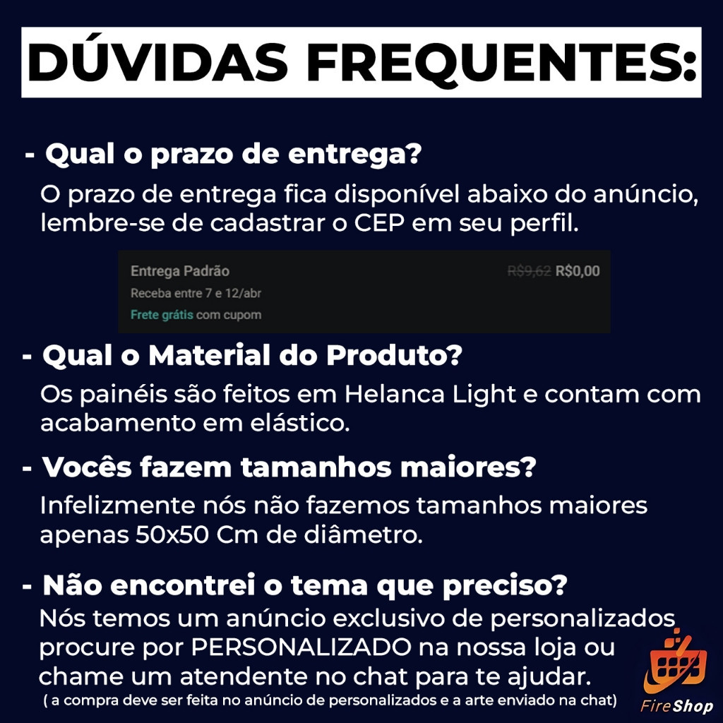 Fire Shop — O Cenário Perfeito para sua Festa! Atenção: a marca d’água aparece somente nas fotos para evitar cópias. O produto físico não possui marca d’água. TODOS VÃO NA QUALIDADE ULTRA HD. Descrição do produto CAPA PAINEL 50X50 NECESSITA DO SUPORTE EM MDF OU ARCO METALICO (não incluso) Caso não tenha encontrado o modelo desejado Procure por PERSONALIZADO em nossa loja, temos um anúncio em que fazemos a arte que desejar, ou chame um atendente no chat para auxilia-lo (a) ATENÇÃO TODAS AS COMPRAS SÃO ENVIADAS EM ATÉ 24 HORAS ÚTEIS ALGUMAS COMPRAS PODEM SER DESPACHADAS NO MESMO DIA PAINEL REDONDO 50X50 ESSA E A MEDIDA REAL NAO CONFUNDAM LEIAM A DESCRIÇAO DESDE JA AGRADEÇO; ESPECIFICAÇÕES DO PRODUTO Os Painéis Redondos são produzidos com qualidade fotográfica em impressão sublimática digital de última tecnologia Estamos sempre atentos às novidades e tendência do mercado O material é Tecido Helanca Light de ótimo caimento e não reflete luz O melhor disso tudo NÃO AMASSA Isso é o sonho de todo decorador Possui costura overlock nas laterais para não desfiar e elástico Apenas para Painéis Redondos e Capas de Cilindro para melhor ajuste Pode ser molhado ou lavado com água e sabão neutro evite ser exposto ao sol pois secam rapidamente As cores dos produtos podem variar de tonalidade em 15 devido resolução do monitor ou tela do celular mas nada que interfira na qualidade e beleza do mesmo SOBRE EFEITOS 3D 4K 8K E GLITTER São efeitos que NÃO podem serem visto à olho nu somente por trás de lentes de câmeras Exemplo quando vamos no cinema e tiramos o óculos fica turvo e aparentemente tremidas as imagens e assim são o mesmo com as imagens impressas Façam o teste se não conhecerem dos efeitos e visualize o quanto ficam lindas e maravilhosas e encante seu público alvo PAINEL REDONDO Não acompanha estrutura A medida é de 50 x50 ATENÇÃO CLIENTES Não fazemos alterações ou troca das imagens do anúncio Não aceitamos artes prontas inclusão de nomes idades (a não ser que a compra seja feita no anuncio de PERSONALIZADOS) Compras com boleto levam de 2 à 3 dias úteis para liberação Caso tenha divergência com seu produto nos acione através dos canais de comunicação antes de efetuar devoluções e cancelamentos nos chame nas mensagens para buscarmos uma solução em conjunto -Pode ser molhado ou Lavado com agua e sabão neutro ,evitar de ser colocado no sol -Veste Fácil C/ Elástico Nas Bordas - Todos os nossos produtos possuem garantia Envie uma mensagem para gente caso tenha algum problema com seu pedido, vamos fazer o possível para garantir sua satisfação. OBSERVACOES IMPORTANTES Atente-se aos prazos de produção e entrega informados no anuncio.