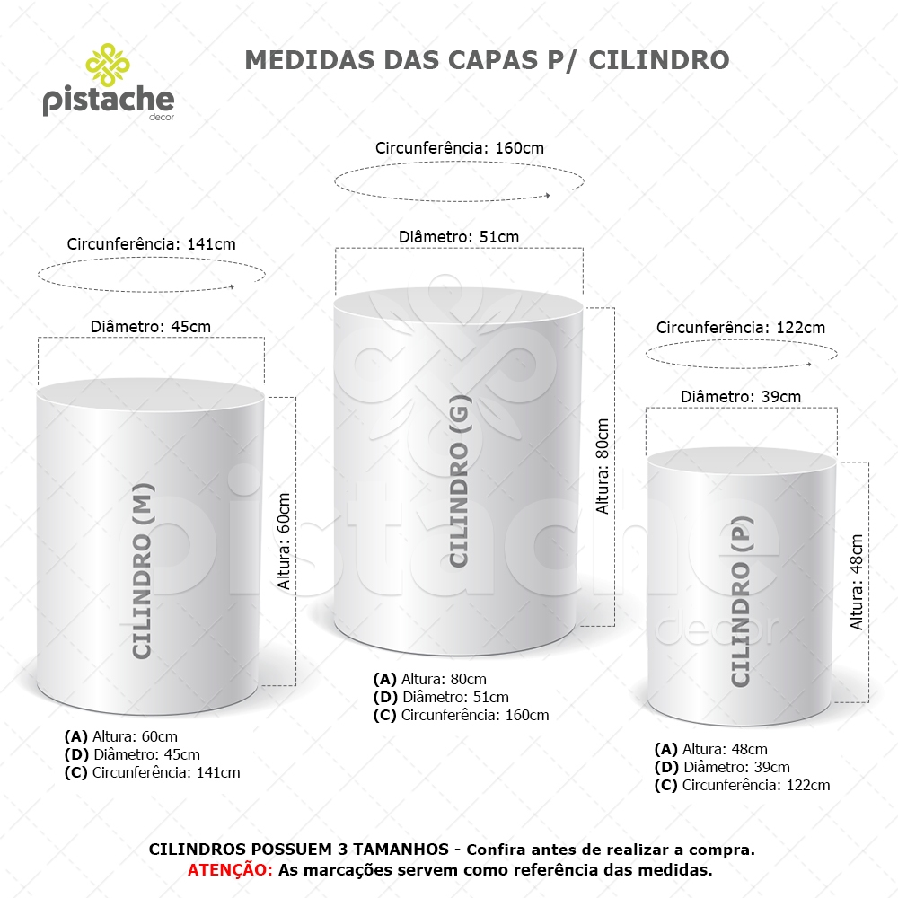 *** ATENÇÃO: NÃO FAZEMOS AJUSTES DE MEDIDA OU ARTE NAS CAPAS DE CILINDRO DESTE ANÚNCIO. VERIFIQUE AS MEDIDAS ANTES DE FINALIZAR A COMPRA *** >>>ATENÇÃO<<< NÃO ACOMPANHA ESTRUTURA/SUPORTE, VENDEMOS SOMENTE AS CAPAS EM TECIDO, SISTEMA VESTE FÁCIL!!! ----------------------------------------------------------------------------------------------------------------------- >>> PAINEL REDONDO EM TECIDO COM ACABAMENTO EM ELÁSTICO <<< UTILIZAÇÃO EM ESTRUTURAS CIRCULARES ENTRE 1,20 ATÉ 1,50 DE DIÂMETRO. >>> PAINEL NÃO POSSUI EMENDA!!! >>> MEDIDAS DO TRIO DE CAPA PARA CILINDRO: TAMANHO P: (A) Altura: 48cm // (D) Diâmetro: 39cm // (C) Circunferência: 122cm TAMANHO M: (A) Altura: 60cm // (D) Diâmetro: 45cm // (C) Circunferência: 141cm TAMANHO G: (A) Altura: 80cm // (D) Diâmetro: 51cm // (C) Circunferência: 160cm Agora sua festa está completa!!! Graças ao Kit de Capas para Cilindro e Painéis Redondos em Tecido da Pistache Decor!!! Você já conhece nossa qualidade na confecção dos painéis de festa e também poderá contar com a gente nas capas de cilindro em tecido sublimado da sua decoração. DETALHES DO TRIO DE CAPA PARA CILINDRO E PAINÉIS REDONDOS EM TECIDO: + Tecido Malha New (Que estica e não amassa). + Tecido Leve com ótimo caimento + Gramatura: 140g/m de excelente qualidade. + Composição do Tecido: 95% Poliéster e 5% de Elastano. + Elástico cuidadosamente costurado na base dos cilindros e ao redor do painel. + Acabamento em overloque evitando que o cilindro desfie. BENEFÍCIOS DAS CAPAS DE CILINDRO E PAINÉIS REDONDOS PISTACHE DECOR: + Sistema "Veste Fácil". Agilidade na instalação + Cores vivas que não desbotam + Sua decoração fica pronta em poucos minutos + Estica e não amassa. + Pode ser lavado quantas vezes for necessário + Não reflete luz, por ser feito em tecido PRODUÇÃO E ENVIO: - TODOS OS PEDIDOS ACOMPANHAM NOTA FISCAL. - O trio de capas é enviado em até 1 DIA ÚTIL após pagamento aprovado. - Possui garantia contra defeito de fabricação. - O envio é feito em embalagem individual e com todo carinho. - Os prazos para entrega variam de acordo com o seu CEP, não nos responsabilizamos pelos prazos dados pela Plataforma. *** Tem alguma dúvida antes de finalizar sua compra? Envie uma mensagem para nós que ajudaremos você! Temos vários anos de experiência no mercado em itens sublimados. ***