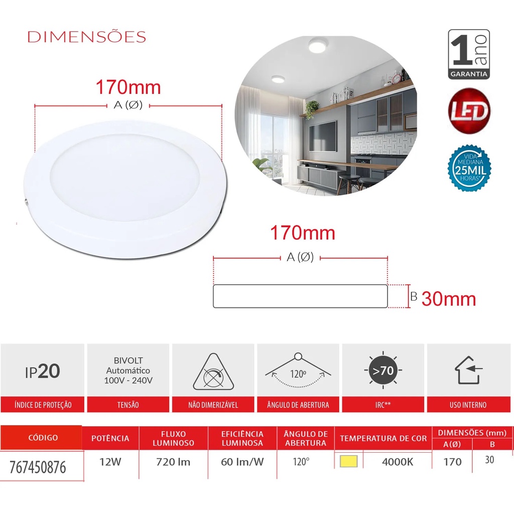 Painel Redondo Sobrepor 12w Neutra 4000K 17cm Bivolt Avant