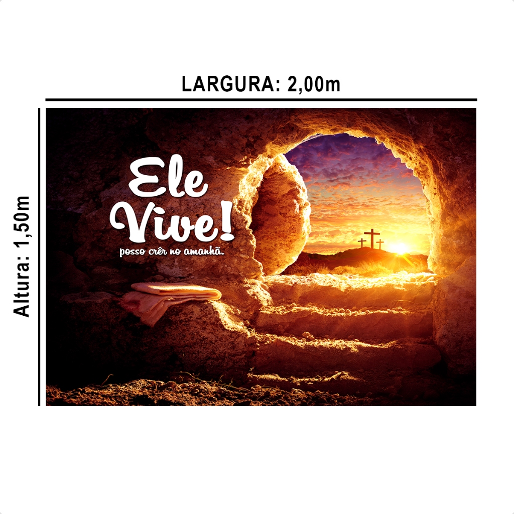Painel Retangular em Tecido Sublimado Horizontal Páscoa Ele vive Ressurreição 2,00x1,50