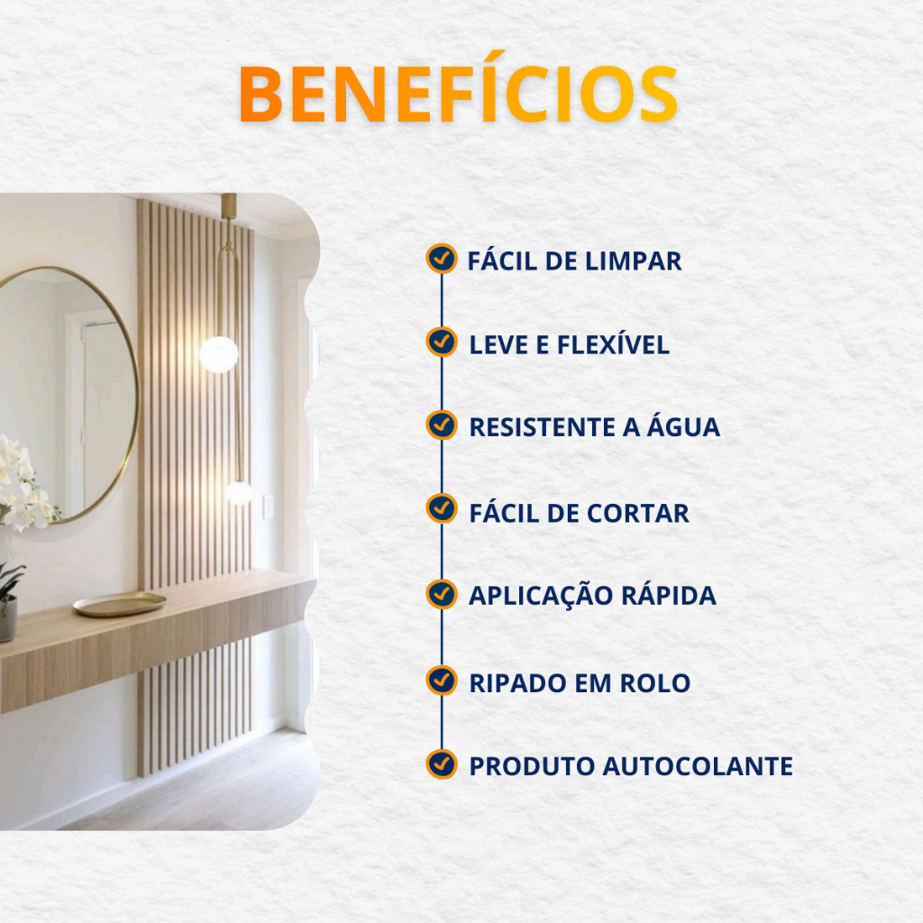 ✨ Painel Ripado Autocolante Rolo com 10 metros – Linha Madeto Renove sua casa de forma rápida e prática! Nosso **painel ripado autocolante em EVA laminado** é a solução perfeita para quem busca sofisticação, aconchego e facilidade de instalação. --- ## ✅ Vantagens * Instalação rápida, sem sujeira e sem necessidade de mão de obra especializada * Autocolante: basta retirar a película protetora e aplicar na parede * Material EVA laminado de alta qualidade, resistente e durável * **Impermeável e fácil de limpar**, ideal também para ambientes úmidos * Versátil: pode ser usado como **lambri, cabeceira, rodapé, roda-teto ou painel decorativo** * Entrega Full: receba seu produto mais rápido * Garantia de 90 dias + nota fiscal --- ## 📏 Especificações Técnicas * Marca: **Meu Rodapé** * Linha: **Madeto Ripado Flexível Autocolante** * Material: EVA Laminado * Medidas: **10 cm (largura) x 10 m (comprimento)** * Cobertura: 1 rolo cobre 1 m² * Espessura: 1 cm * Acabamento: Laminado rígido com textura amadeirada * Autoadesivo: **Sim** * Impermeável: **Sim** * Origem: Nacional --- ## 🛠️ Como Aplicar 1. Certifique-se de que a superfície esteja **limpa, lisa e seca** 2. Retire a película protetora do adesivo 3. Cole o painel diretamente na parede, alinhando as ripas 4. Pressione bem para garantir fixação ⚠️ **Atenção:** não enrole o painel no sentido contrário ao da embalagem para evitar marcas na parte laminada (isso compromete a garantia). --- ## 📦 Itens Inclusos * 1 rolo de **Painel Ripado Autocolante EVA 10cm x 10m** = 1 m²* * Manual de instalação ####PERGUNTAS FREGUENTES Do que o produto é feito? Este produto é feito em uma borracha sintética (EVA) específica para a decoração e recebe uma laminação especial com fita de borda (a mesma utilizada na indústria moveleira). O material possui alta resistência, qualidade e flexibilidade, se adaptando a paredes levemente curvas. O que é metro linear? Basicamente, o metro linear será aquele em linha reta. Ou seja, a medida saindo do ponto A até o ponto B. Esta distância será o metro linear. Você poderá medir a metragem linear utilizando uma régua, uma trena ou um metro convencional. Como é o processo de colagem? Não usamos fita dupla-face. Desenvolvemos uma cola específica para a decoração, mais forte e resistente, que garante a fixação do seu produto por anos e anos, sem dor de cabeça. A cola é protegida por uma película. Basta você retirar essa película e aplicar na sua parede. Como limpar? Não amarela? Utilize pano de algodão, água e sabão neutro para a manutenção do painel ripado. Não use objetos abrasivos, como esponjas ou escovas. Tem outras cores? Posso pintar? O produto já está pronto para uso. Não é necessário pintar. Você encontra os ripados da linha Urban nas cores Black, Blue, Bronze, Corten e White, linha Play nas cores Azul, Verde, Creme, Rosa e Cinza, linha Madeto as cores Nogueira Intenso e Nogueira Natural. Posso instalar em áreas externas e banheiros? Não recomendamos a instalação em áreas molhadas, como dentro do box. Em áreas externas, banheiros e outras situações específicas pode ser necessário o reforço com cola de contato ou silicone. ##Como calcular a metragem que preciso? Para fazer o estilo ripado, primeiro você deve verificar a altura do produto que vai utilizar (ex: 10cm). Depois, pense no espaçamento que você vai deixar entre as peças (ex: 1cm). Faça a soma da altura do produto com o espaçamento (neste caso, seria 11cm). Agora, é hora de ver quantas peças cabem em sua parede. Pra isso, divida a largura da parede (em centímetros) pela soma obtida anteriormente. Ex: Parede de 200cm (200/11 = 18,18). Sempre arredonde para mais, no caso do exemplo, teríamos então o número 19. Esse é o número de ‘ripas’ que você vai precisar. Agora é hora de multiplicar o número de ripas pela altura do seu painel (em metros). Se ele vai ter 1,30m, você deve fazer 19x1,30. O resultado seria 24,7 (arredondando, teríamos 25m). Essa é a quantidade mínima que você precisa para o projeto. Lembre-se de sempre adquirir de 5 a 10% a mais para possíveis perdas. Caso tenha dúvidas, fale com nossa equipe de consultoras através do WhatsApp que simplificamos essa conta pra você. ## 🏆 Garantia & Compra Segura * Garantia de **90 dias** * Nota fiscal emitida para CPF/CNPJ * Atendimento especializado disponível 24/7 --- ✨ Transforme seu ambiente com estilo, praticidade e elegância! ➡️ **Adquira já o seu Painel Ripado Autocolante 10m e dê um novo visual à sua casa!**