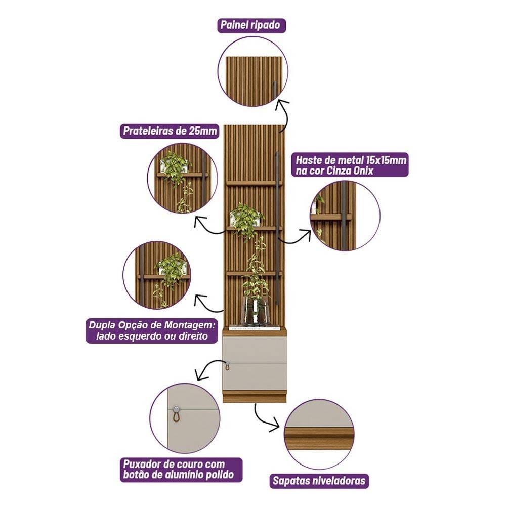 Que tal um produto multiuso para deixar a sua casa mais linda, moderna e funcional? Essa é a proposta da Mpozenato com o Painel Ripado com Mesa de Apoio Industrial 1 Módulo 44cm Golden L06 Nature/Off White. Vem conferir! Desenvolvido para agregar medida e estilo quando combinado ao rack com painel ripado da Linha Golden, esse módulo alia a contemporaneidade do ripado com o estilo industrial presente nas hastes metálicas que destacam as prateleiras. Mas engana-se quem pensa que ele pode ser aproveitado somente na sala de estar, pois o seu design permite utilizá-lo também como mesa de cabeceira. Ah! Ele pode ser montado do lado esquerdo ou direito, basta usar a imaginação e harmonizá-lo com os demais móveis do quarto e pronto. Demais não é mesmo? Então, confira os detalhes a seguir e dê asas à sua imaginação com a Mpozenato! Dimensões dos Produtos Largura: 44 cm. Altura: 198 cm. Profundidade: 41 cm. Peso: 25 kg. Características do Produto Material da estrutura: MDP/MDF. Acabamento: Pintura UV. Escala de Brilho: Fosco. Peso Suportado: 49 kg distribuídos. Quantidade de Portas: 1 Porta. Tipo de Dobradiças: Metálicas. Quantidade de Prateleira: 3 Prateleiras. Possui Puxador: Sim. Material do Puxador: Couro com detalhe metálico. Possui Pés: Sim. Tipo de Pés: Rodapé/Sapatas Niveladoras. Possui LED: Não. Possui Passa-fios: Não. Diferenciais: - Design moderno. - Porta com detalhe frisado. - Tampo em MDP 37mm e prateleira 25mm. - Módulo lateral multiuso, podendo ser instalado como mesa de cabeceira, mesa de apoio para sala ou combinado com o rack e painel da Linha Golden. - Montagem opcional do lado esquerdo ou direito. Sistema de Montagem: Parafusos/Cavilhas/Minifix. Manual de Montagem: Sim. Complexidade da Montagem: Média. Volumes: 1 Volume. Conteúdo da Embalagem: 1 Módulo Lateral. Garantia do Fabricante: 90 dias contra defeito de fabricação. Montagem: Recomendamos que seja feita por um profissional. Recomendação de Limpeza: Utilize pano levemente úmido. Observações importantes - Produto para uso residencial em ambiente interno, não devendo ficar exposto diretamente ao sol, calor e umidades excessivas. - Pode haver alguma diferença de tonalidade entre a imagem e o produto real, por conta do tratamento de imagens e a calibração de cores do seu monitor. - As imagens são meramente ilustrativas, não acompanham objetos de decoração e eletrônicos. - Confira o estado da embalagem, não devendo assinar o comprovante em caso de danos. - Não asseguramos, no ato da entrega, por subir escadas/elevadores, pelo transporte por guincho em apartamentos ou montagem, desmontagem e instalações. Eventuais despesas são por conta do comprador. - Confira as dimensões do produto e certifique-se de que passará normalmente por supostos elevadores, portas, escadas e/ou corredores de sua residência.