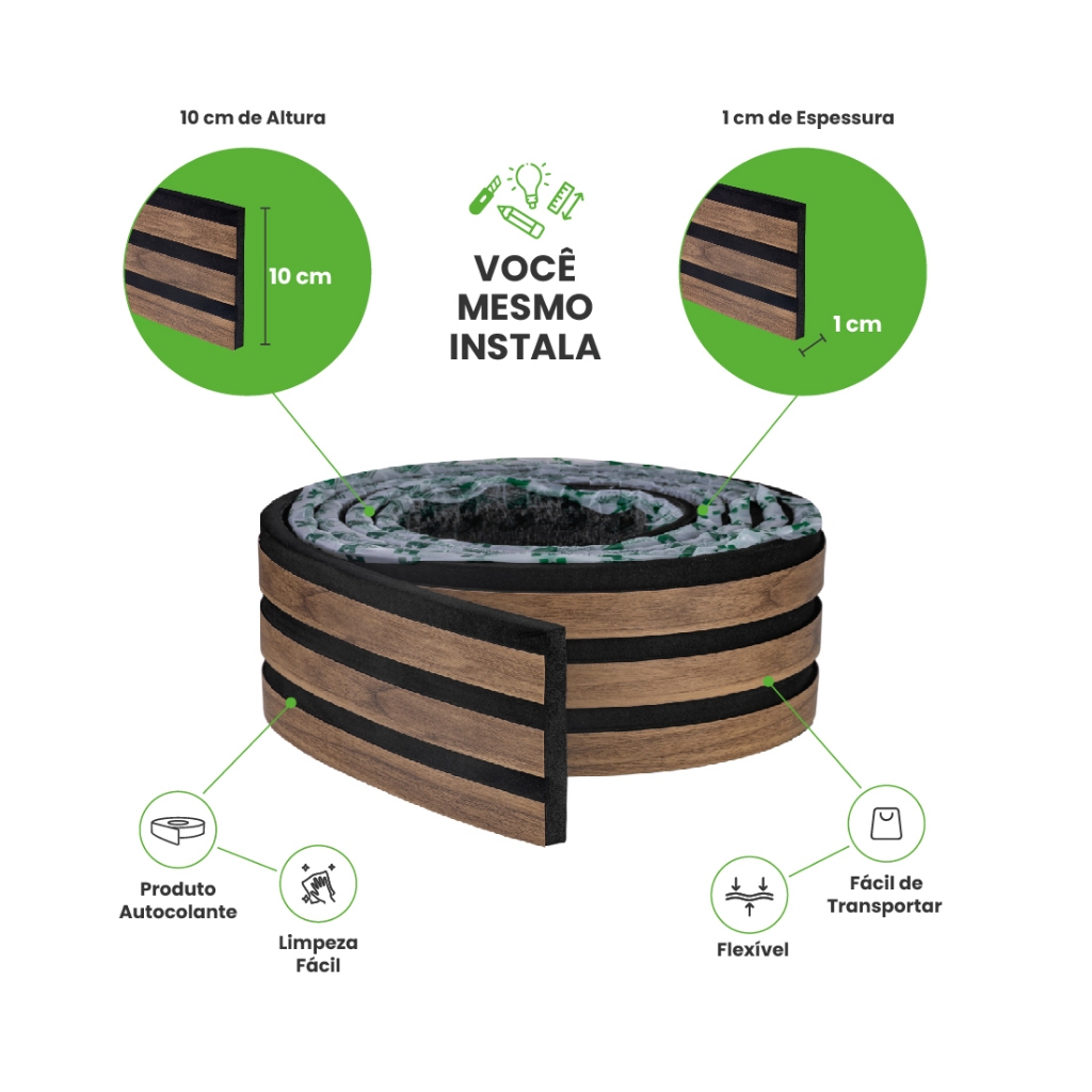 O kit é enviado já cortado e cada unidade contém 5 ripas de 110cm. Cobre uma área de 50cm x 110cm. Caso precise de mais do que um kit, basta informar no campo "quantidade". Dê um toque de modernidade ao seu ambiente com os painéis ripados da Meu Rodapé! Com os ripados em meia parede da linha Urban, você dá ao seu ambiente um pouco mais de elegância e contemporaneidade. Nossos produtos possuem uma tecnologia autocolante própria, desenvolvida especificamente para a decoração. Isso garante obras rápidas, práticas, limpas e sem complicação. O processo de fixação é muito simples. É tão fácil que você mesmo pode aplicar o produto. Sem ferramentas, sem sujeira e sem contratação de mão de obra - o que deixa o valor final da transformação muito mais em conta quando comparado a outros materiais. Depois de escolher a cor que mais lhe agrada, basta você dizer a largura que deseja o seu painel. O kit é enviado já cortado e cada unidade contém 5 ripas de 110cm cada e um perfil de acabamento de 2,5m. Cobre uma área de 50cm x 110cm. Caso precise de mais do que um kit, basta informar no campo "quantidade". Diferente de outros materiais, o nosso é flexível, autocolante e se adapta a paredes curvas com facilidade. Aproximadamente 95% dos clientes instalam sozinhos, reduzindo em até 3x o valor final da obra. Utilizamos uma borracha sintética (EVA específico para a decoração) em nossa produção. Desenvolvemos uma cola, fruto de inovação tecnológica, que garante maior fixação e durabilidade. Não utilizamos fita dupla-face. É uma tecnologia própria e exclusiva. Inove na sua decoração, utilize criatividade aliada a tecnologia. A Meu Rodapé é uma empresa que tem a inovação na sua essência. Nós nascemos para mudar o rumo da decoração. Somos a Revolução na Decoração 💚 Utilizamos uma borracha sintética (EVA específico para a decoração) em nossa produção e desenvolvemos uma cola inovadora e exclusiva. Os produtos autocolantes são nossa especialidade. Garantimos a melhor qualidade e custo x benefícios do segmento. Com o tempo, desenvolvemos nossos produtos e alcançamos mais de 500 mil lares. Hoje somos a N°1 em Acabamentos Autocolantes 🥇
